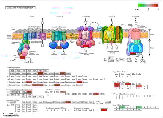 Mapping of differentially abundant proteins onto the oxidative phosphorylation pathway. KEGG-based representation of mitochondrial respiratory chain complexes I–V highlighting subunits identified in the proteomic dataset. Red boxes indicate proteins significantly upregulated in hemin-treated mosquitoes, whereas green boxes denote subunits detected in the proteomes but not differentially abundant within this pathway; no significantly downregulated proteins were observed. This pathway-level visualization summarizes the distribution of stage-specific proteomic hits within a canonical metabolic framework and represents a qualitative mapping rather than a direct measure of pathway activity, biochemical flux, or functional activation.
