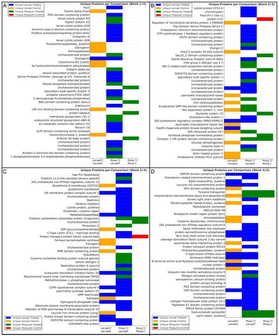 Unique proteins identified in each experimental group of A. aegypti under heme exposure. Proteins uniquely detected in each condition are grouped according to comparisons between larvae and adults. Each block (A–D) displays proteins exclusively identified in a specific experimental group: LarvaeT (hemin-treated larvae, blue), LarvaeC (control larvae, orange), Mosq.T (hemin-treated adults, green), or Mosq.C (control adults, red). Horizontal bars indicate the exclusive presence of each protein within the LarvaeT/LarvaeC, Mosq.T/LarvaeT, and Mosq.T/Mosq.C comparisons. Identified proteins highlight condition- and stage-specific signatures related to oxidative stress defense, detoxification, energy metabolism, muscle contractility, structural remodeling, and proteostasis, illustrating the divergence of larval and adult proteomic responses to heme-induced oxidative stress.