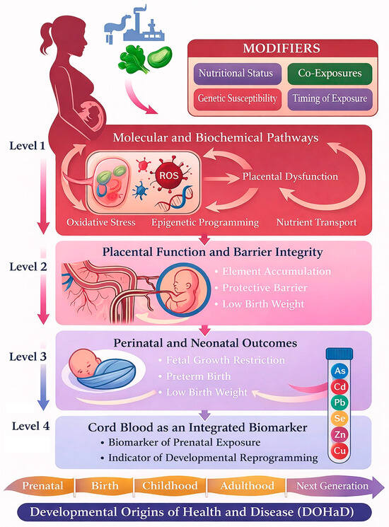While prior reviews typically summarize trace element toxicology either at the mechanistic level or at the level of pregnancy outcomes, our four-level model explicitly links molecular nodes (redox, mitochondrial, endocrine, epigenetic), the placenta as a biological mediator and selective barrier with regulated transporter expression, perinatal and neonatal endpoints, and synchronized biomarker matrices (maternal blood–placenta–cord blood) as measurable “readouts” of fetal exposure. The model also integrates mixture effects and antagonistic/synergistic mineral balance (e.g., Zn/Cd, Se-dependent antioxidant systems) as modifiers of pathway activation, consistent with the DOHaD perspective. Finally, by mapping outcomes to exposure matrices and timing, the framework supports hypothesis generation regarding critical windows of susceptibility and improves comparability across heterogeneous studies. Core DOHaD mechanisms are illustrated in Figure 1, which integrates molecular perturbations, placental mediation, perinatal outcomes, and potential life-course trajectories.