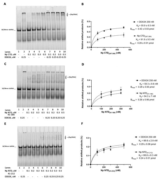 To investigate whether DDX3X influences the dsRNA binding affinity of the isolated NTD and CTDs of SARS-CoV-2 Np, Np NTD and Np CTD titrations were performed in the presence of 18/38mer dsRNA and in the absence or presence of a fixed amount of DDX3X and were analyzed by Electrophoretic Mobility Shift Assay (EMSA). Two NTD fragments were used, namely Np NTD(41–186) and Np NTD(41–212) (Scheme 1). Increasing concentrations of Np CTD(247–364) and both Np NTDs alone resulted in a proportional increase in Np-RNA complexes (Figure 1A,C,E, lanes 2–5). Addition of a fixed amount of DDX3X caused an increase in the high molecular weight complexes (indicated by asterisks in Figure 1A,C,E lanes 6–9). High molecular weight bands seen in DDX3X-only controls were not considered as they represent excess of DDX3X protein that does not bind dsRNA, as confirmed by WEMSA assay (Supplementary Figure S1). Quantification of the shifted products from three independent experiments allowed estimation of apparent binding parameters, including apparent affinity (Kd) and the maximal fraction of bound dsRNA (Bmax). Binding efficiency was estimated by the Bmax/Kd ratio. Np CTD alone showed a Bmax/Kd value of 3.1 pmol·µM−1, which increased to 7.5 pmol·µM−1 in the presence of DDX3X (Figure 1B). The Np NTD(41–186) domain showed an apparent Bmax/Kd of 2.7 pmol·µM−1 and the addition of DDX3X increased the Bmax/Kd value up to 4.9 pmol·µM−1 (Figure 1D). Similarly, the Np NTD(41–212) showed an apparent Bmax/Kd of 2.7 pmol·µM−1 and the addition of DDX3X resulted in an increase in the Bmax/Kd value to 4.4 pmol·µM−1 (Figure 1F). Overall, the data summarized in Table 1 indicated that the Np CTD exhibited higher dsRNA binding efficiency compared to the two Np NTDs. However, in the presence of DDX3X stimulation, the dsRNA binding affinity of Np NTD and CTDs increased.