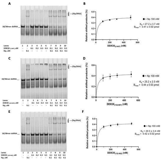Interaction of DDX3X(2–607), DDX3X(132–607), DDX3X(132–662) RNA helicase domains with the Np–dsRNA complex. Asterisks (***) in all panels indicate the high molecular weight Np–dsRNA complexes. (A) EMSA showing the titration of DDX3X(2–607) in the presence of dsRNA and in the absence (lanes 3–5) or in presence (lanes 7–10) of Np. Lane 1—control on the absence of proteins; Lane 2—control in the presence of Np. (B) Np–dsRNA complex formation as a function of DDX3X(2–607) concentrations in the presence (squares) of the Np. (C) As in (A), but with DDX3X(132–607) replacing DDX3X(2–607). (D) Np–dsRNA complex formation as a function of DDX3X(132–607) concentrations in the presence (squares) of the Np. (E) As in (A), but with DDX3X(132–662) replacing DDX3X(2–607). (F) Np–dsRNA complex formation as a function of DDX3X(132–662) concentrations in the presence (squares) of the Np. Curves in (B,D,F) were fitted with the software GraphPad Prism 9.0. and the data points represent the mean of three independent experiments ± S.E.