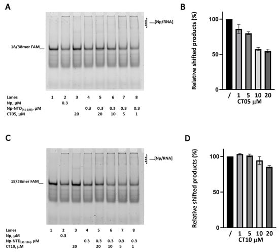 CT05 and CT10 inhibition of Np NTD(41–186)–dsRNA binding. Asterisks (***) in all panels indicate the high molecular weight NTD–dsRNA complexes. (A) EMSA showing the CT05 inhibitor effect on NTD–dsRNA binding (lanes 5–8). Lane 1—control in the absence of protein and inhibitor; Lane 2—control in the presence of Np alone; Lane 3—control in the presence of the inhibitor alone; Lane 4—control in the presence of Np NTD(41–186) alone. (B) Reduction in NTD–dsRNA product in the presence of CT05 inhibitor indicated as a percentage of relative shifted product. Data points represent the average of two independent experiments ± SD; graphic bars were drawn using the software GraphPad Prism 9.0. (C) As in (A), but with CT10 replacing CT05. (D) As in (B), but with CT10 replacing CT05.