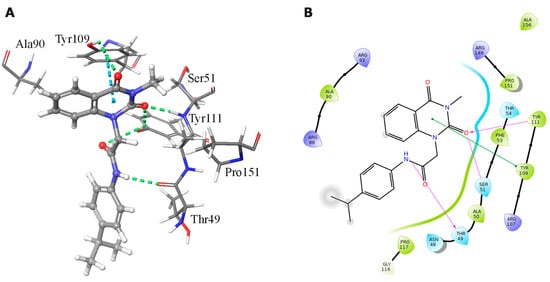 Among them, CT05 and CT10 showed activity in EMSA (Figure 9). In particular, CT05 reduced by almost 50% the Np NTD(41–186)-dsRNA binding at a concentration of 10 µM, while CT10 was effective at 20 µM. Both compounds interacted with the RNA binding site on NTD, thus representing promising scaffolds for further optimization. In the case of the docked complex built with the Np structure stored in 7xwz (taken as the representative example of all the NP structures studied, Figure 10), the endocyclic carbonyl oxygen atom of CT05 served as a hydrogen bond acceptor for both the phenolic hydroxyl group of Tyr111 and the backbone NH moiety of Ser51 (Figure 11). Another hydrogen bond was found between the exocyclic carbonyl oxygen atom of the hit compound and the terminal guanidino moiety of Arg149. The complex was further stabilized by a π-π parallel stacked interaction between the aromatic portion of Tyr109 and the central bicyclic core of the ligand. Hydrophobic contacts involved the polymethylene portion of the Arg92 side chain, Ala50 and Ala90 methyl groups, as well as the cyclic portion of Pro151. CT10 occupied the same region of the RNA binding site and showed similar interactions (Figure 12). In fact, the endocyclic oxygen atom showed a bifurcated hydrogen bond with both the phenolic hydroxyl group of Tyr111 and the backbone NH moiety of Ser51. Moreover, a π-π parallel stacked interaction between the aromatic portion of Tyr109 and the bicyclic core of the ligand was also found. An additional hydrogen bond was made between the amide NH of the ligand and the backbone carbonyl oxygen atom of Thr49.