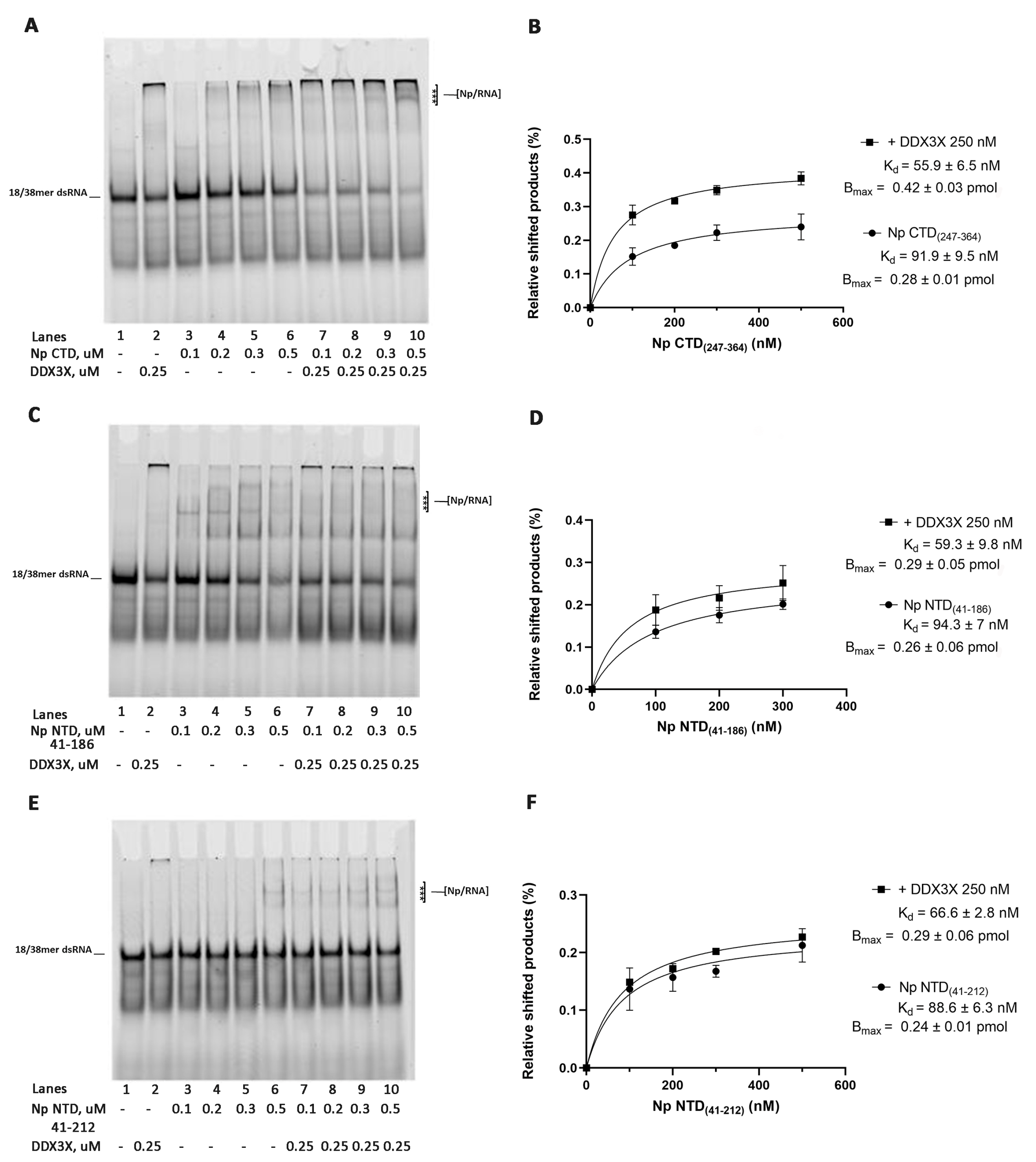 | Np NTD(41–186) + DDX3X | 59.3 ± 9.8 | 4.9 ± 0.6 |