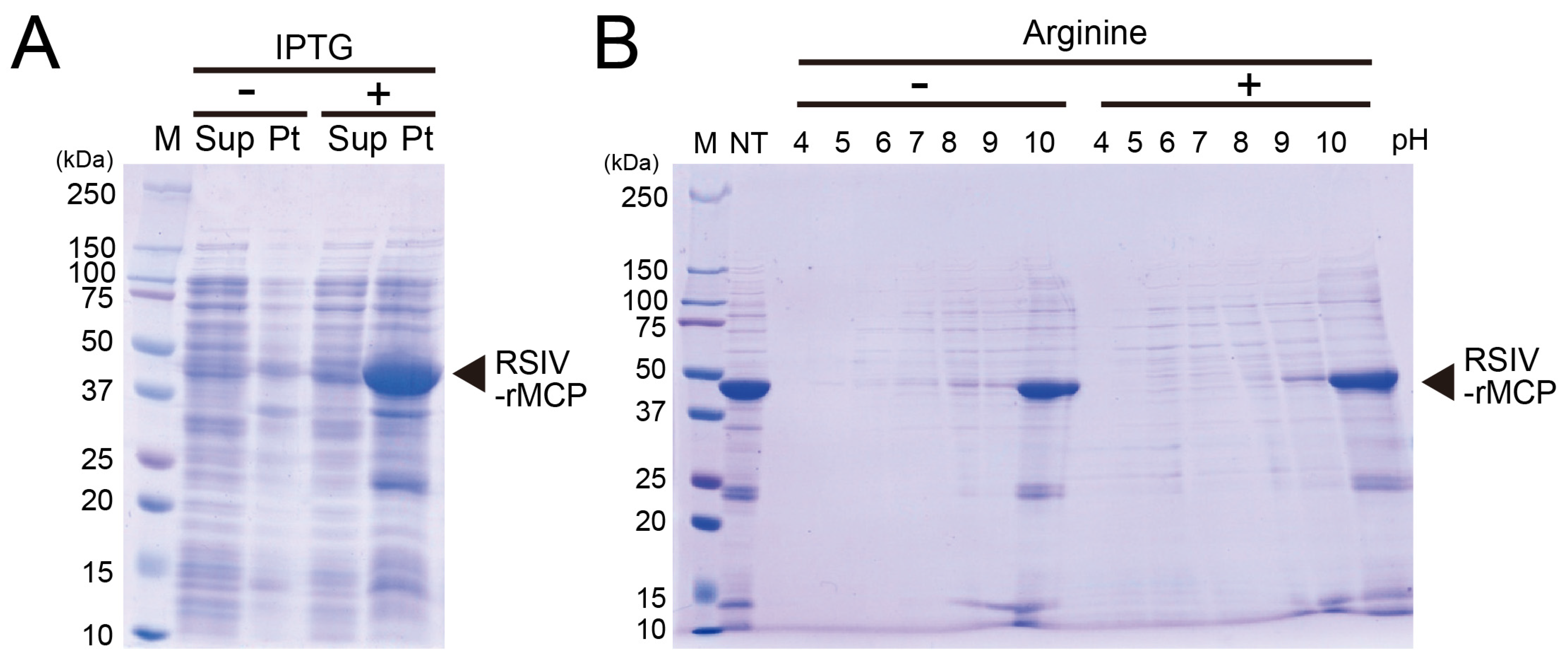 2.1. Preparation of RSIV-rMCP via High-Hydrostatic-Pressure Refolding