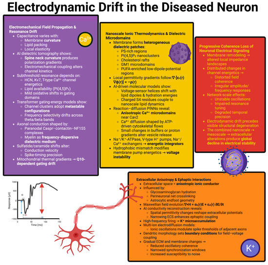 Physics-informed neural networks trained on high-density electrophysiological recordings have provided accurate models of the evolution of extracellular fields with previously unknown precision, illustrating that small changes in matrix composition can significantly affect the coherence of extracellular fields over large spatial scales. Narrowing of the extracellular space due to astrocytic swelling or osmotic fluctuations enhance ephaptic interactions [67]. High-frequency firing causes localized K+ accumulation, and recent electrodiffusion models using learned nonlinear diffusion operators demonstrate that these ionic fluctuations can modify the threshold of spike generation in adjacent axons. Variations in the morphology of the dendrites affect the boundary conditions that control how the extracellular fields communicate with the intracellular voltage [68,69]. Graph neural network integrated multi-scale finite element reconstructions have shown that variations in membrane conductivity or branching of the dendrites will redistribute impedance landscapes, affecting how neurons filter extracellular signals. These cumulative changes occur as the membrane composition changes, the extracellular anisotropy increases, and the ionic dynamics fluctuates. As a result, there is a progressive narrowing of synchronization windows, reduced stability of oscillation patterns, and increased susceptibility of neuronal networks to noise [70].