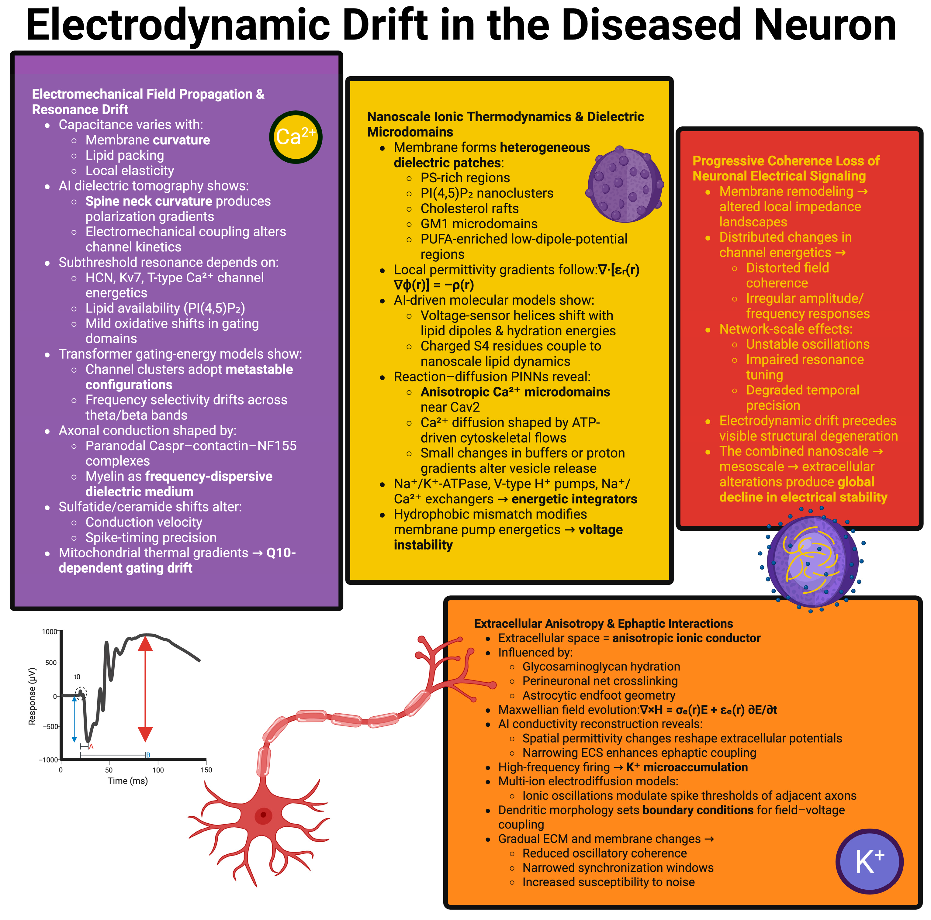 Electrodynamic Drift in the Diseased Neuron. This Figure demonstrates the molecular scale deformation of the protein energy landscape leading to a gradual progression of instability within all of the domains of the neuron’s electro-dynamic properties including dielectric, electrolytic, mechanical–electromechanical and external to the cell membrane.