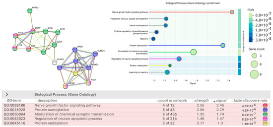 Protein–protein interaction network. Network evidence—STRING false discovery rate (FDR) < 0.01. Protein identifiers are given according to UniProtKB/Swiss-Prot. BDNF—Brain-Derived Neurotrophic Factor (P23560), NGF—Nerve Growth Factor (P01138), neurotrophins NTF-3 (P20783) and NTF-4 (P34130), SYN1—Synapsin 1 (P17600), SYT1—Synaptotagmin 1 (P21579), SYP—Synaptophysin (P08247) and SYNPO—Synaptopodin (P08247), PSD95 (DLG4)—Post-Synaptic Density Protein (P78352), NPTX2—Neuronal Pentraxin (P47972), SUMO 1-4—Small Ubiquitin Like Modifier (P63165; P61956; P55854; Q6EEV6), UBC 9 (UBE2I)—Ubiquitin Conjugating Enzyme E2I (P63279), NEDD 8—Neural Precursor Cell Expressed, Developmentally Down-Regulated 8 (Q15843), NAE1 (APPBP1)—NEDD8 Activating Enzyme E1 Subunit 1 (Q13564), UBC 12 (UBE2M)—Ubiquitin Conjugating Enzyme E2M (P61081). The color scheme of the circles in the table corresponds to the names of the biological processes in which the proteins in the network diagram participate. The signal is defined as a weighted harmonic mean between the observed/expected ratio and −log(FDR).