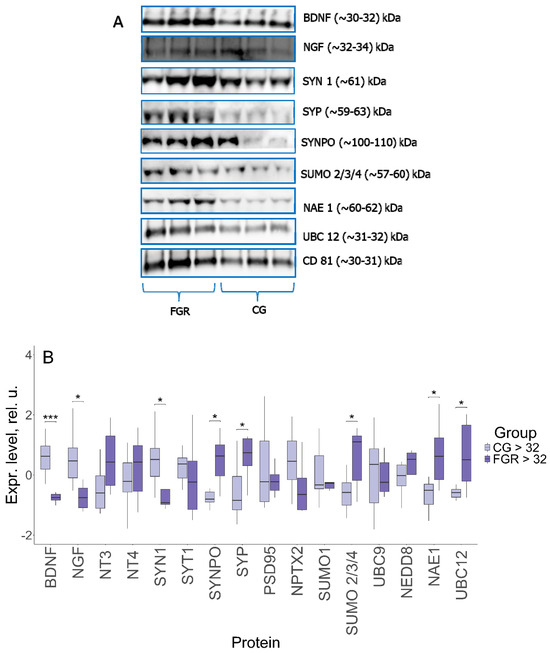 Evaluation of the protein expression pattern was conducted by Western blotting in the FNVs, isolated from the blood plasma of pregnant women with late-onset FGR and of the comparison group (Figure 2).