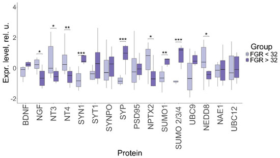In particular, neurotrophin NGF level (0.23, −0.66; p ≤ 0.04) was significantly lower, while the levels of NT-3 (−0.01, −0.55 p ≤ 0.04) and NT-4 (0.23, −0.48 p ≤ 0.007) were significantly higher in early-onset FGR compared to the late-onset condition. At the same time, the BDNF levels differed insignificantly between early-onset and late-onset FGR (−0.15, −0.24; p = 0.08). The synaptic protein SYN1 level (−0.83, 0.44 p ≤ 0.001) was significantly lower in early-onset FGR compared to the late-onset form, while SYP level (−0.86, 0.98 p ≤ 0.001) was significantly higher in late-onset FGR. In the meantime, the expression of NPTX2 (0.82, −0.7 p ≤ 0.04) was increased in early-onset FGR. Expression of the proteins involved in sumoylation, SUMO 1 (−0.65, 0.57; p ≤ 0.004) and SUMO 2/3/4 (−0.9, 1.19; p ≤ 0.0001), was significantly higher in late-onset FGR compared to early-onset FGR, while the level of the neddylation protein NEDD8 (0.4, −0.42; p ≤ 0.02) was higher in the early-onset form. In general, the pattern of expression demonstrates a tendency toward a greater change in early-onset FGR compared to the late-onset condition.