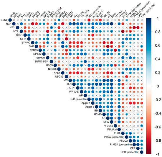Correlation matrix obtained from the analysis of correlations between protein expression in FNVs and clinical parameters in late-onset FGR. The diameter of the circles and the color indication (according to the scale on the right) are proportional to the correlation coefficient; the fields where the statistical significance of the correlation coefficients is greater than 0.05 are crossed out. SYT1—Synaptotagmin 1, SYN1—Synapsin 1, SYP—Synaptophysin, SYNPO—Synaptopodin, NW—newborn weight, H-C—heel-crown, H-C (percentile)—heel-crown percentile, HC(N)—head circumference of newborn, WP—weight percentile, WP (US)—weight percentile (ultrasound), BD—biparietal diameter of the fetus, HC(F)—head circumference of fetus, AC—abdominal circumference, EFW—estimated fetal weight, PI UtA.s.—Pulsatility index of Uterine Artery (left), PI UtA.d.—Pulsatility index of uterine artery (right), PI UA—Pulsatility index of umbilical artery, PI UA (percentile)—Pulsatility index of umbilical artery percentile, PI MCA—Pulsatility index of middle cerebral artery, PI MCA (percentile)—Pulsatility index of middle cerebral artery percentile, CPR—cerebral placental ratio, CPR (percentile)—cerebral placental ratio percentile.