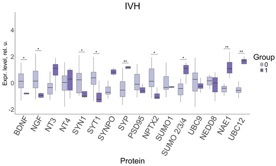 A significant decrease in the levels of neurotrophins BDNF (−0.76, 0.14; p ≤ 0.01) and NGF (−0.94, 0.15; p ≤ 0.01); of the proteins involved in the modulation of synaptic transmission and the release of neurotransmitters: SYN1 (−0.99, 0.24; p ≤ 0.04) and SYT1 (−1.24, 0.39; p ≤ 0.01); and of NPTX2 protein (−1.07, 0.14; p ≤ 0.01), involved in the formation of excitatory synapses and clustering of glutamate receptors, was found to be associated with IVH in neonates with late-onset FGR. Moreover, the levels of SYP synaptic protein (1.22, −0.53; p ≤ 0.002); sumoylation proteins SUMO 2/3/4 (1.11, −0.41; p ≤ 0.04); and neddylation proteins NAE1 (1.09, −0.4; p ≤ 0.004) and UBC12 (1.68, −0.55; p ≤ 0.001), demonstrated a significant increase in IVH.