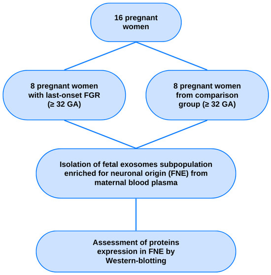 The study included pregnant women under maternal care at the Federal State Budget Institution “National Medical Research Center for Obstetrics, Gynecology and Perinatology named after Academician V.I. Kulakov” of the Ministry of Health of the Russian Federation. Pregnant patients with late-onset FGR (n = 8; ≥32 weeks of gestation) using the Delphi procedure were selected for the pilot study [12]. The comparison group comprised pregnant women at similar terms of gestation (n = 8; ≥32 weeks of pregnancy) with uncomplicated pregnancy and no signs of any disorders in the fetuses according to the routine antenatal tests (Figure 6).