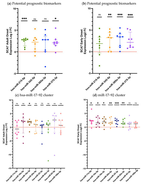 The relative miRNA expression in the plasma of patients with the Adult Onset (AO) and Early Onset (EO) SCA7 phenotypes. (a) Expression levels of potential prognostic candidate miRNAs in AO patients; (b) Expression levels of prognostic candidate miRNAs in EO patients; (c) Expression levels of miRNAs belonging to the miR-17~92 cluster in AO patients. (d) Expression levels of miRNAs belonging to the miR-17~92 cluster in EO patients. The quantification was performed using RT-qPCR, with hsa-miR-483 serving as an endogenous control. The data for the three miRNAs analyzed is shown as medians and interquartile ranges. Results are shown as log2 fold change (Log2FC), where positive and negative values indicate an increase or decrease in relative expression to the reference group. Log2FC greater than 1 is considered as change. The expression differences between the SCA7 group and the control group were determined by the Mann–Whitney U test. A p-value of p < 0.05 was considered significant; asterisks denote significant differences between patients with SCA7 and controls (* p < 0.05; ** p < 0.01; *** p < 0.001). ns = no significant.
