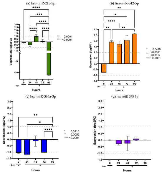 Validation of prognostic miRNAs in the inducible MIO-M1 SCA7 glial model. MIO-M1 Q10+ATXN7 cells were used as the reference group, and MIO-M1 Q64+ATXN7 cells were induced with (+Dox) or without (−Dox) doxycycline (1 mg/mL) for 24, 48, 72, and 96 h. Expression of the four prognostic miRNAs was quantified using the ∆∆CT method and normalized to U6, RNU44, and RNU48. Panels (a–d) display the expression profiles of hsa-miR-215-5p, hsa-miR-342-5p, hsa-miR-365a-3p, and hsa-miR-375-3p, respectively. Results are shown as log2 fold change (Log2FC), where positive and negative values indicate an increase or decrease in relative expression to the reference group. Log2FC greater than 1 is considered as change. Bars represent mean ± SD of duplicate assays. Statistical differences across time points were assessed using a repeated-measures ANOVA with Tukey post hoc comparison (p < 0.05). Asterisks denote significant differences between patients with SCA7 and controls (* p < 0.05; ** p < 0.01; *** p < 0.001; **** p < 0.0001).