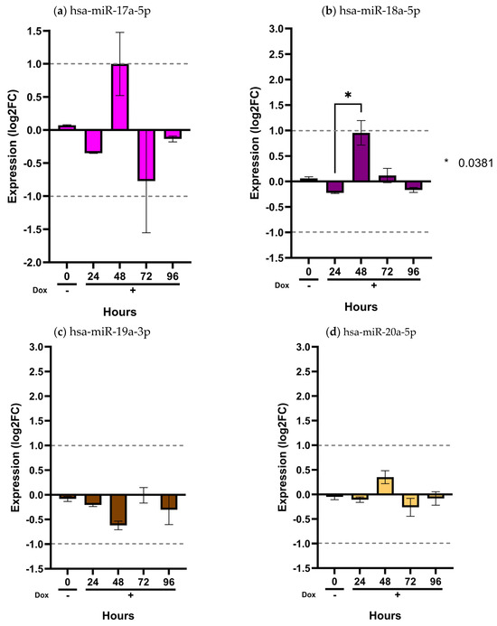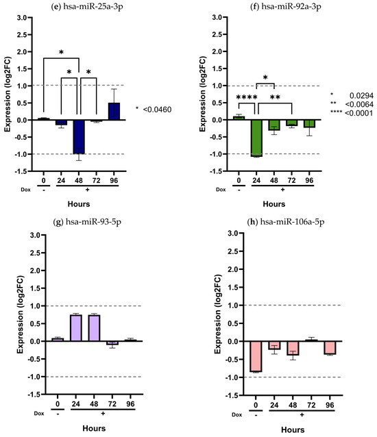 Validation of the miR-17/92 cluster in the inducible MIO-M1 SCA7 glial model. MIO-M1 Q10+ATXN7 cells served as the reference group, while MIO-M1 Q64+ATXN7 cells were induced with (+Dox) or without (−Dox) doxycycline (1 mg/mL) for 24, 48, 72, and 96 h. Expression of the eight miRNAs from the miR-17/92 cluster was quantified using the ∆∆CT method, normalized to U6, RNU44, and RNU48. Panels (a–h) show the expression profiles of hsa-miR-17a-5p, hsa-miR-18a-5p, hsa-miR-19a-3p, hsa-miR-20a-5p, hsa-miR-25-3p, hsa-miR-92a-3p, hsa-miR-93-5p, and hsa-miR-106a-5p, respectively. Results are shown as log2 fold change (Log2FC), where positive and negative values indicate an increase or decrease in relative expression to the reference group. Log2FC greater than 1 is considered as change. Bars represent mean ± SD of duplicate assays. Statistical differences across time points were assessed using a repeated-measures ANOVA with Tukey post hoc comparison (p < 0.05). Asterisks denote significant differences between patients with SCA7 and controls (* p < 0.05; ** p < 0.01; **** p < 0.0001).