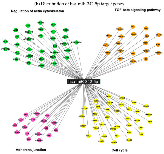 Interestingly, within the most enriched pathways, hsa-miR-342-5p exhibited the potential to regulate a set of biologically relevant target genes involved in proliferation, differentiation, migration, and tissue maintenance. Notably, among its predicted negatively regulated targets in the cell-cycle pathway, we identified key cyclins such as CCNA2, CCNB1, and CCND1, as well as critical regulators of cell division, including CDC14B and CDC25A/B. In addition, hsa-miR-342-5p may influence cell-cycle suppression through targets such as CDKN1A (p21) and RB1 (Figure 6b). Within the TGF-β signaling pathway, hsa-miR-342-5p is predicted to modulate major components of both the canonical (Smad2, Smad3, Smad4) and non-canonical (MAPK/ERK) branches, including bone morphogenetic proteins BMP4 and BMP7, as well as their receptor BMPR2 (Figure 6b). Furthermore, in the adherens junction and actin cytoskeleton regulation pathways, hsa-miR-342-5p may target essential genes involved in cell adhesion and structural integrity, such as ACTB (β-actin), NECTIN3, CFL1 (cofilin), Raf1 and actin-modulating formins including DIAPH1 (Figure 6b).
