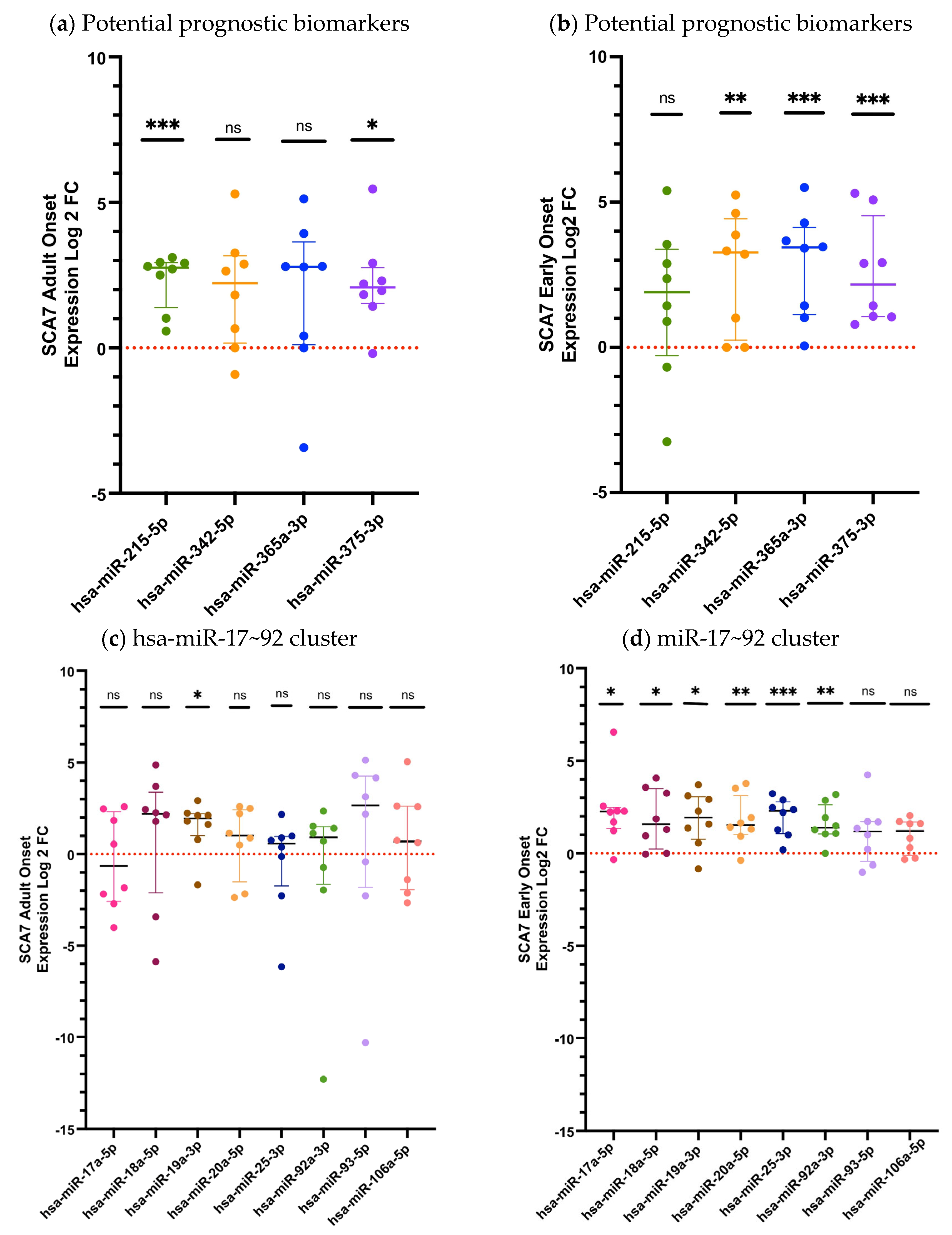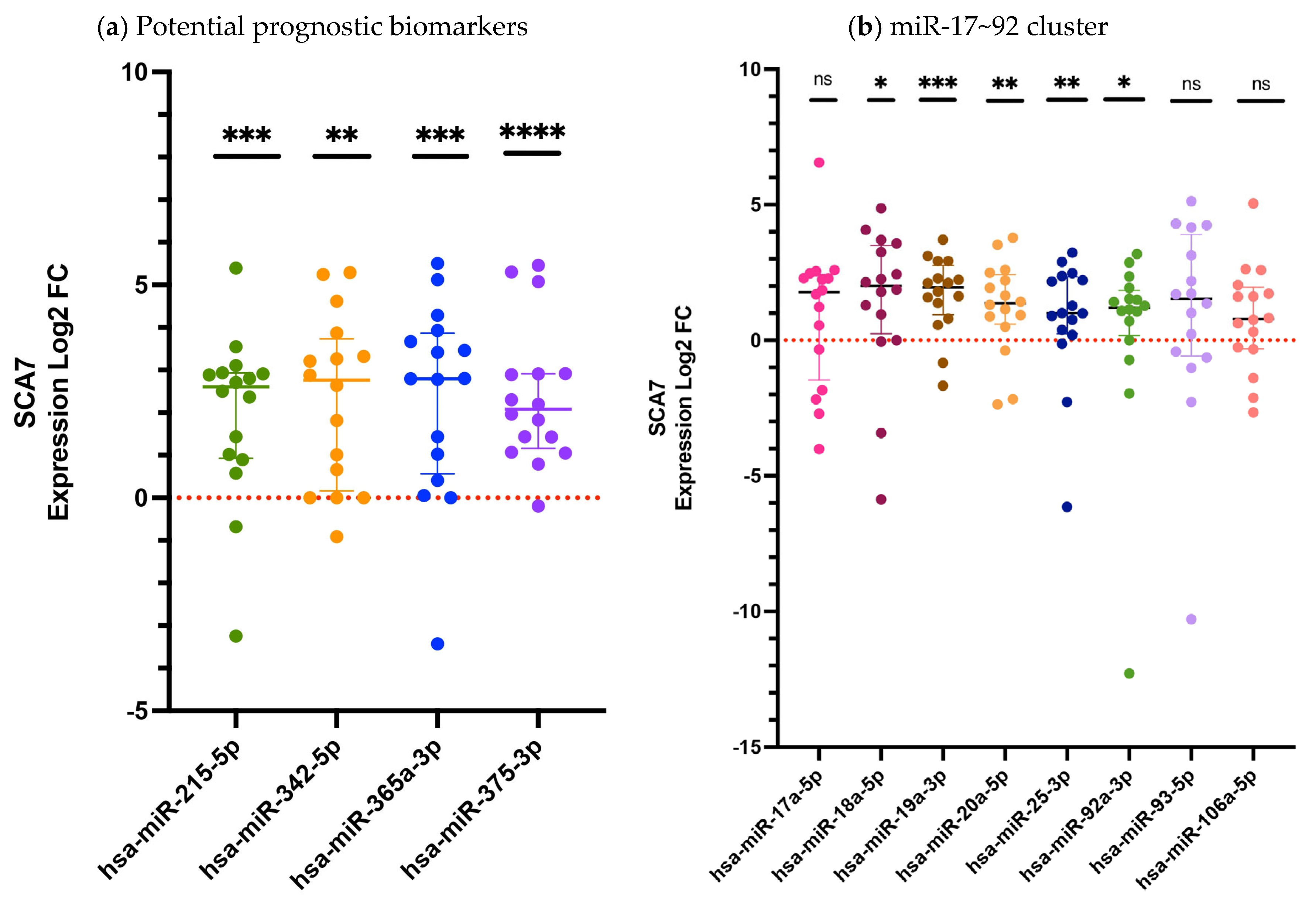 2.1. Differential Expression of Circulating miRNAs in Patients with SCA7