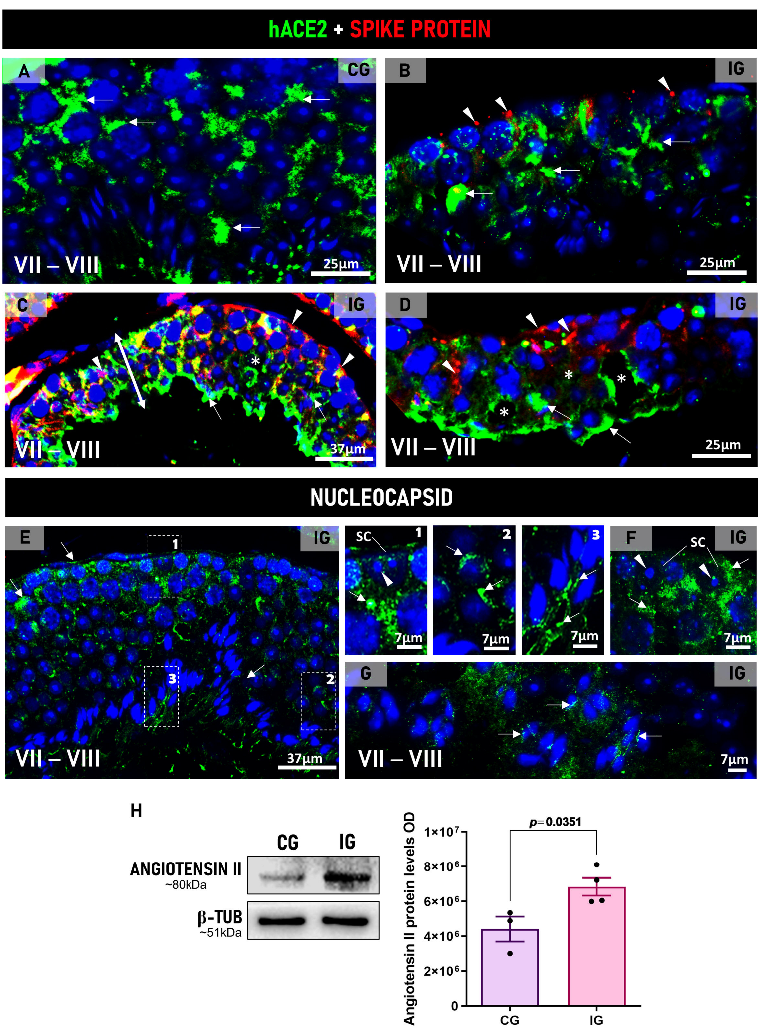 3.1. SARS-CoV-2 Infects the Seminiferous Epithelium and Increases Angiotensin II and hACE2 Expression