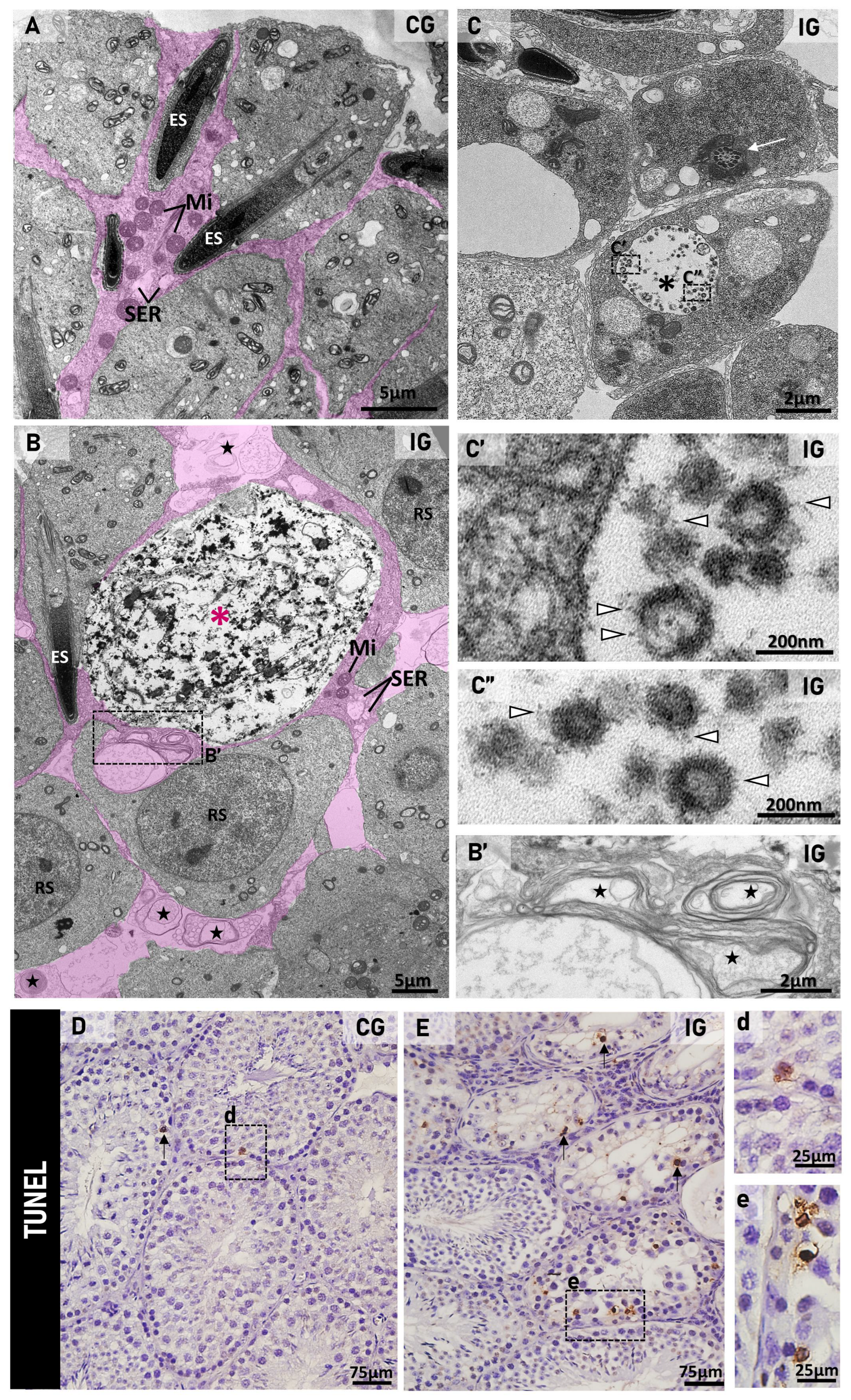 - de Oliveira, S.A.; da Silva, A.A.S.; Hinton, B.T.; Cerri, P.S.; Sasso-Cerri, E. SARS-CoV-2 exploits steroidogenic machinery, triggers lipid metabolism for viral replication and induces immune response in Leydig cells of K18-hACE2 mice. Front. Cell. Infect. Microbiol. 2025, 15, 1538461, Correction in Front. Cell. Infect. Microbiol. 2026, 15, 1702430. [Google Scholar] [CrossRef]