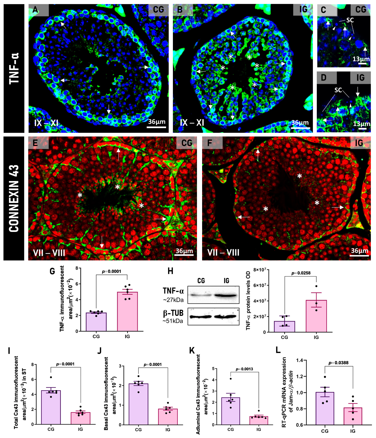 2.5. Viral Infection Increases Cytokines and Impairs Junctional Molecules and Spermatogenic Activity
