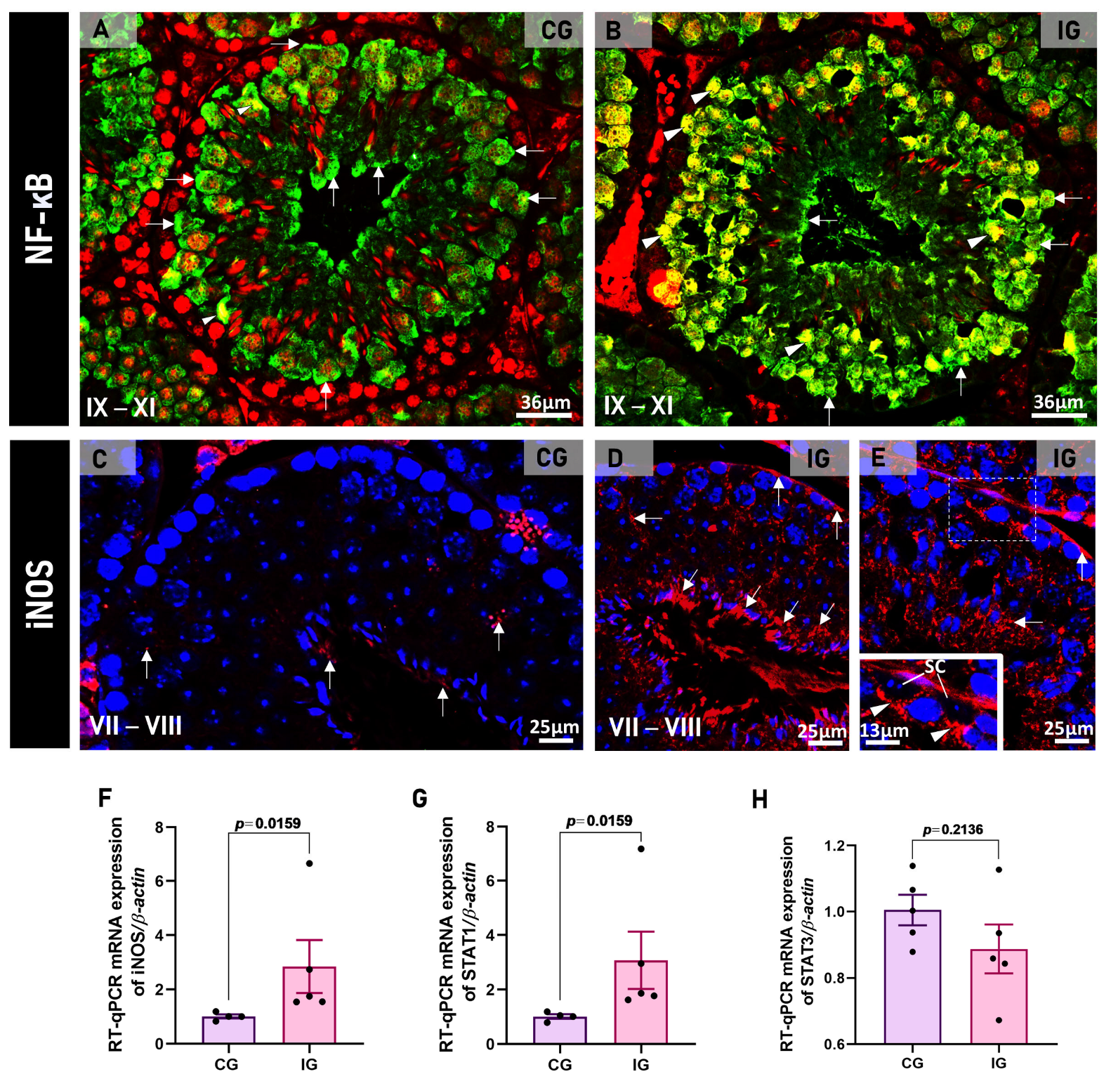 - Terayama, H.; Naito, M.; Qu, N.; Hirai, S.; Kitaoka, M.; Ogawa, Y.; Itoh, M. Intratesticular expression of mRNAs of both interferon γ and tumor necrosis factor α is significantly increased in experimental autoimmune orchitis in mice. J. Reprod. Dev. 2011, 57, 296–302. [Google Scholar] [CrossRef] [PubMed]