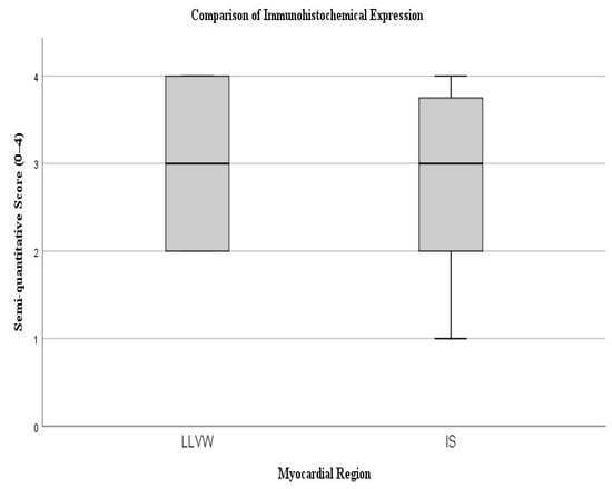 A non-parametric Mann–Whitney U test was performed to evaluate whether the difference between the semi-quantitative scores was statistically significant. The analysis yielded a U value of 109.0 (p = 0.880), indicating that the difference between groups was not statistically significant. These findings suggest comparable levels of immunohistochemical expression between the two myocardial regions, with a trend toward slightly greater staining intensity in the lateral ventricular wall (Figure 2).