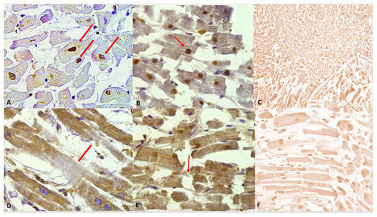 (A) Grade 1 (+): isolated and disseminated nuclear expression, demonstrated (red arrows) by nuclear brownish staining. 20×. (B) Grade 2 (++): expression in scattered foci. The nuclear brown reaction is more evident and intense. A slight reaction can be observed in myofibers, too. A nucleus with squaring of its edges is shown (red arrow) as a sign of cardiomyocyte damage. (C) Negative control: Any immunohistochemical reaction is shown. (D) Grade 3 (+++). Myofibrillar expression in widespread foci. The immunostaining is demonstrated by a clear brown reaction involving myofibers, compared to the negativity in the nuclei. An area of hyporeactivity in a degenerated myofiber is shown (red arrow). (E) Grade 4 (++++). Myofibrillar and nuclear widespread expression. The brown reaction is evident. Myofibrillar breakage is shown (red arrow). (F) Grade 0 (−). Negative control, magnification 40×.