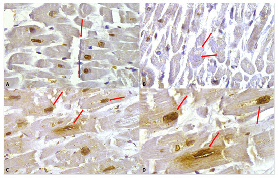 (A) Myofibrillar rhexis with doubling of the rupture extremity (red arrows). Cardiomyocytes nuclei immunostaining is shown, along with a slight positivity in myofibers. (B) Contraction bands (red arrows) in the context of myofiber moderate positivity immunostaining. (C) Nuclear and perinuclear positive immunostaining (red arrows) 40×. (D) Clearly visible at higher magnification, the nuclear and perinuclear positive (red arrows) immunostaining, 60×.