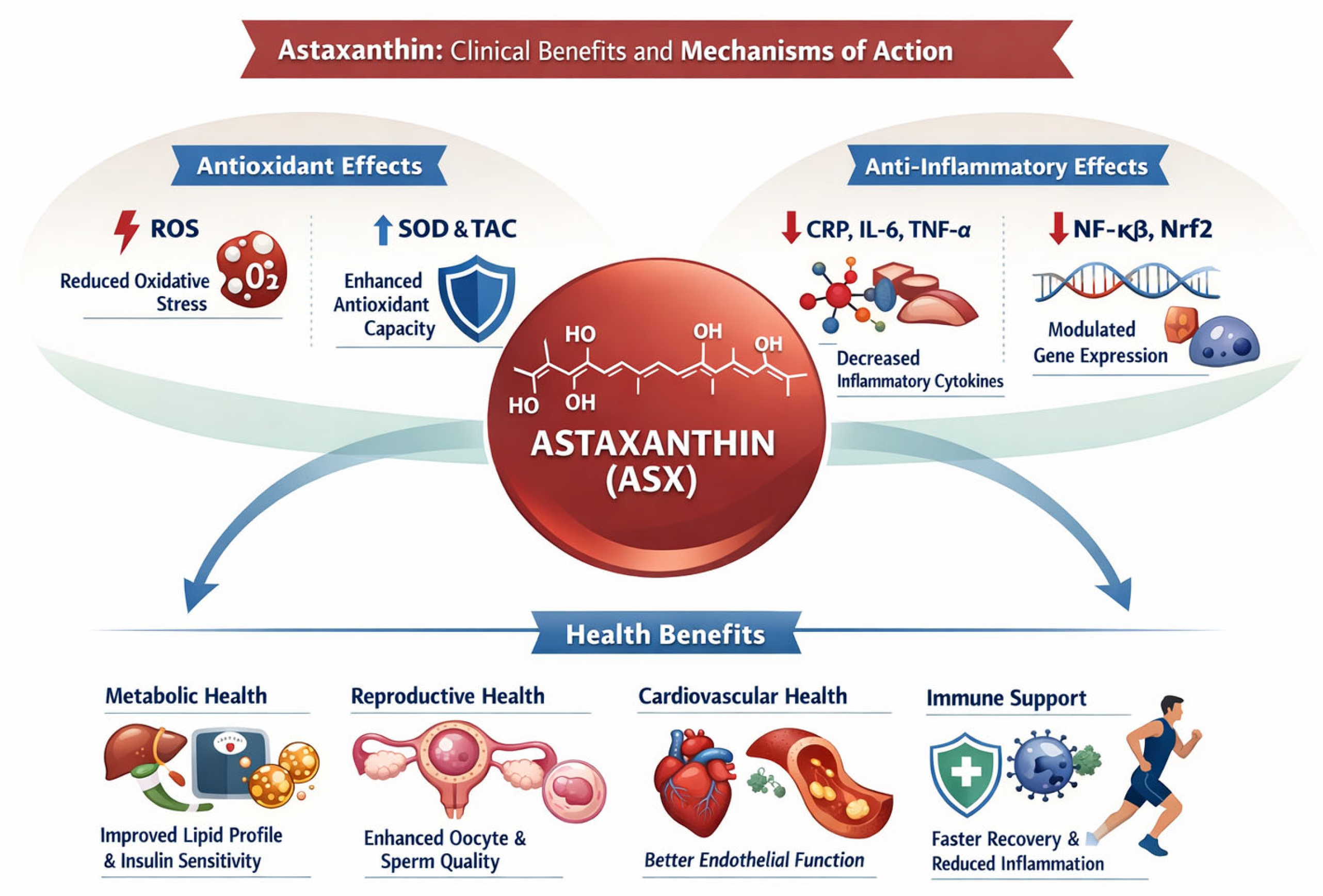 | Jabarpour et al. (2024) [Phytother Res] [145] | Triple-blind randomized clinical trial | 58 infertile women with Polycystic Ovary Syndrome (PCOS); Iran | To investigate the effect of ASX on lipid profile, insulin resistance (IR), blood pressure, and oxidative stress | Duration: 8 weeks. Dosage: 12 mg/day (2 × 6 mg) ASX or placebo. Measurement of FBS, Insulin, HOMA-IR, malondialdehyde (MDA), TAC, SOD, and lipid profile | ASX significantly reduced fasting blood sugar (FBS), HOMA-IR, Insulin, MDA and LDL cholesterol. It increased total antioxidant capacity (TAC) and HDL cholesterol. No effect on blood pressure or BMI |