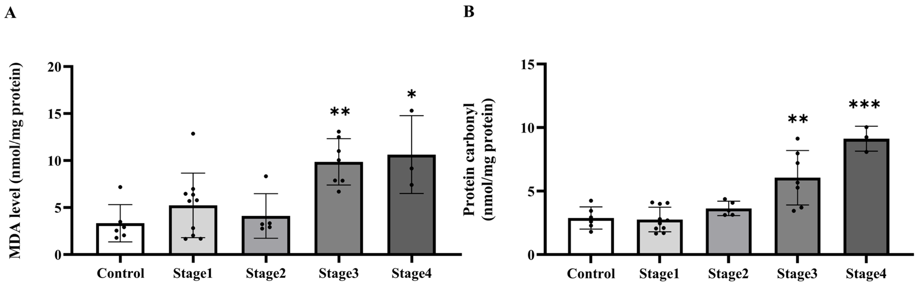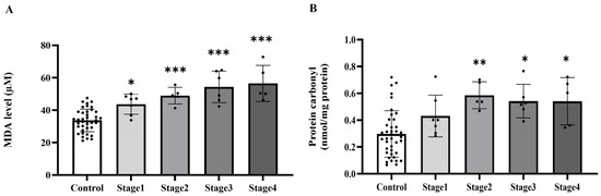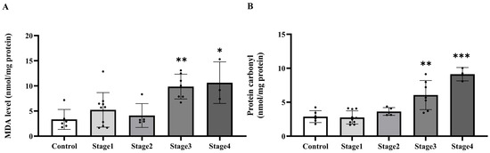Plasma malondialdehyde (MDA, (A)) and protein carbonyl (B) of the control group and cancer groups by stage. Results are depicted as mean ± standard error (SEM). *** p < 0.0001, ** p < 0.001, * p < 0.05.