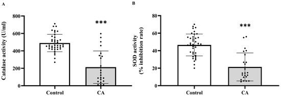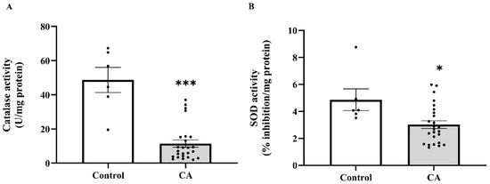 Plasma catalase (A) and superoxide dismutase (SOD, (B)) activities in plasma of the control and cancer groups. Results are depicted as mean ± standard error (SEM). Comparison between two groups was performed using Student’s t-test. *** p < 0.0001. CA: cancer group.