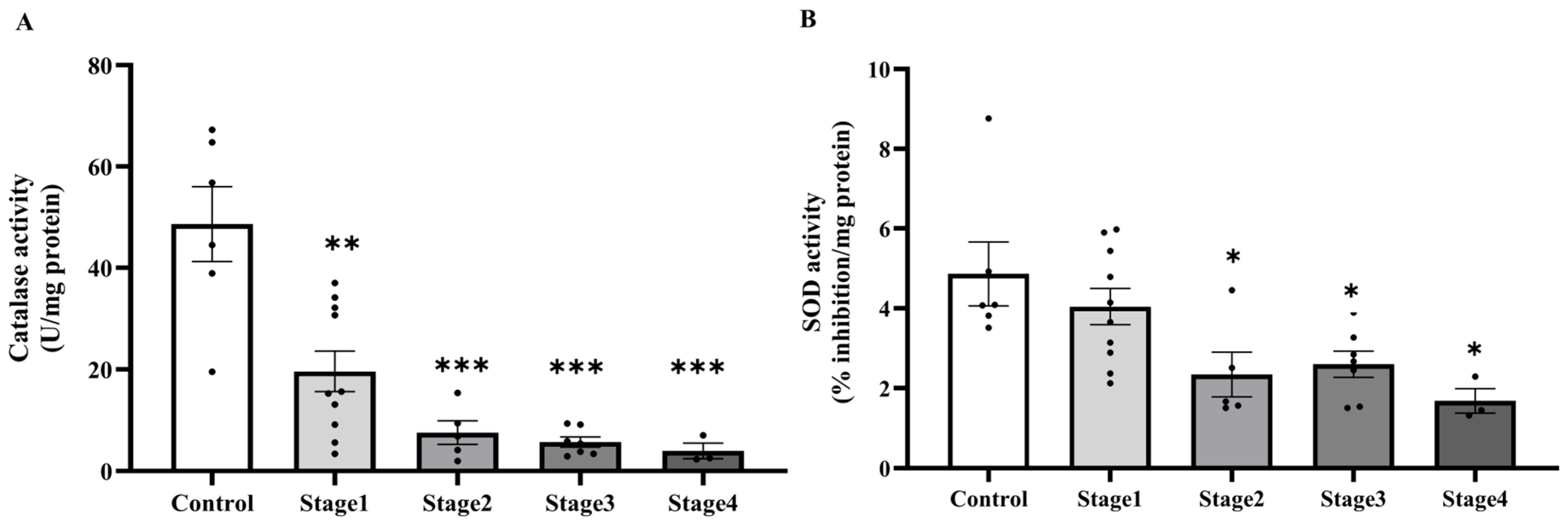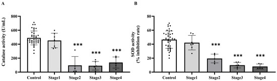 Plasma catalase (A) and superoxide dismutase (SOD, (B)) activities in plasma of the control and cancer groups by stage. Results are depicted as mean ± standard error (SEM). One-Way ANOVA was used for comparisons between groups. *** p < 0.0001.