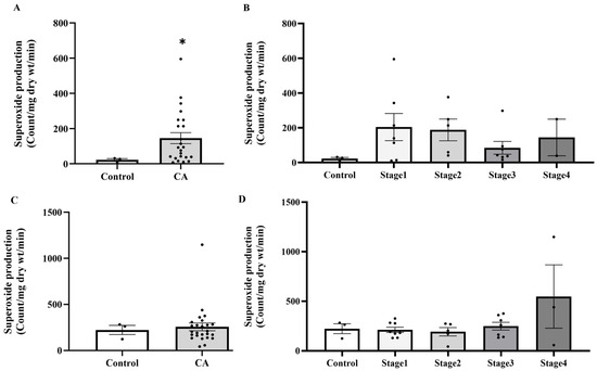 Superoxide production in peritumoral adipose tissue (A) and colonic tissue (C) in the control and cancer groups and in control and cancer groups by stage (B,D). Results are depicted as mean ± standard error (SEM). Comparison between two groups was performed using Student’s t-test, while One-Way ANOVA was used for comparisons between three or more groups. * p < 0.05. CA: cancer group.
