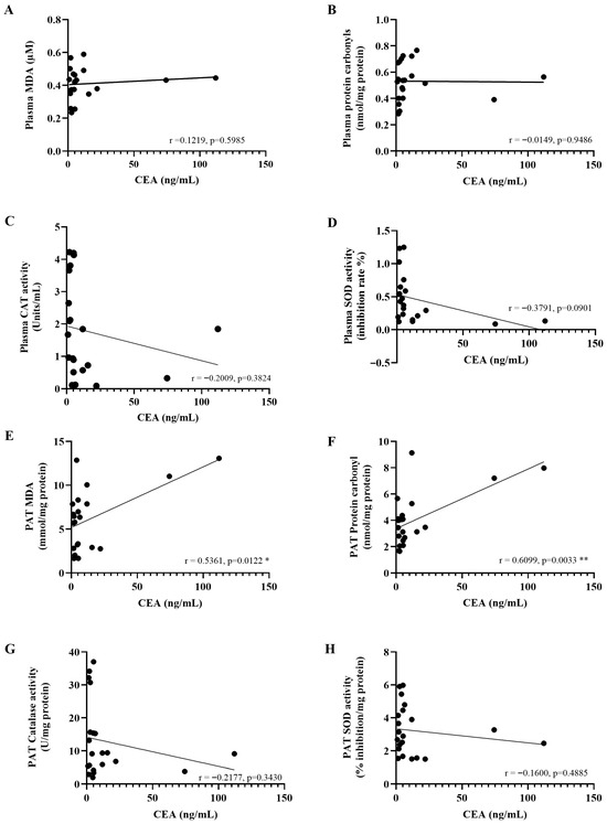 The correlation between carcinoembryonic antigen (CEA) levels and oxidative stress biomarkers in the plasma (A–D) and peritumoral adipose tissue (E–H). Pearson’s correlation test was employed to assess the relationships between variables. * p < 0.05; ** p < 0.01. PAT; Peritumoral adipose tissue.