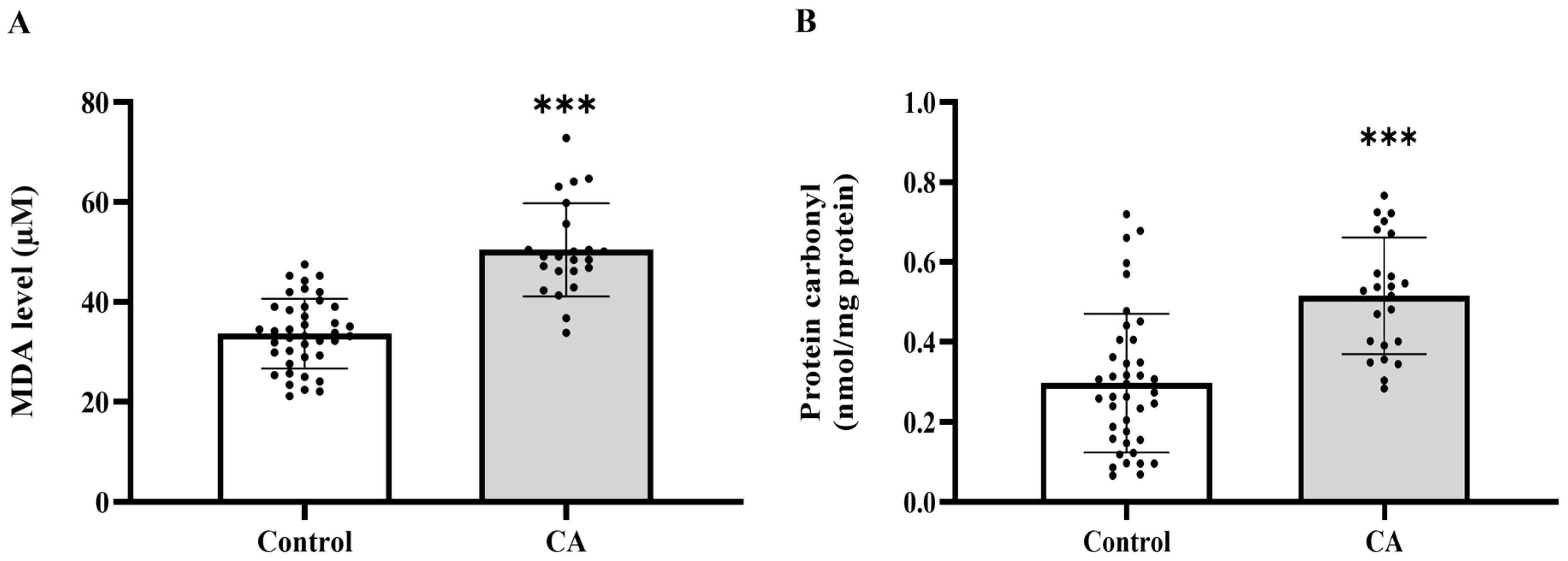 Plasma malondialdehyde (MDA, (A)) and protein carbonyl (B) of the control and cancer (CA) groups. Results are depicted as mean ± standard error (SEM). Comparison between two groups was performed using Student’s t-test. *** p < 0.0001. CA: cancer group.