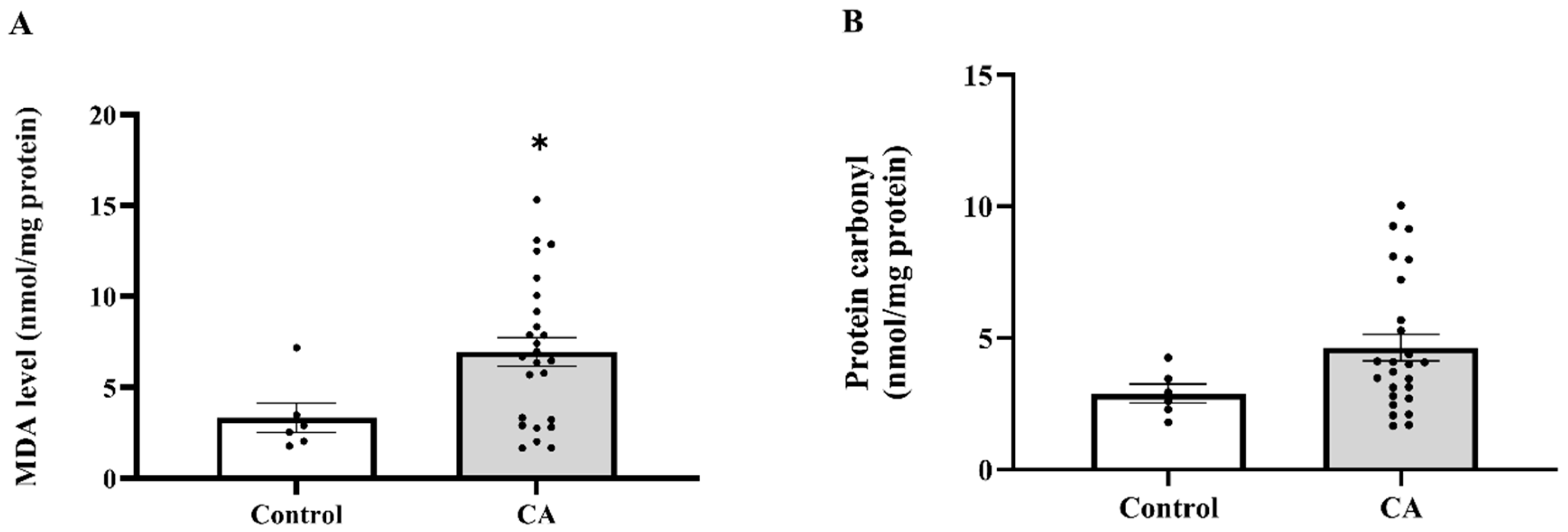 2.2. Plasma MDA and Protein Carbonyl