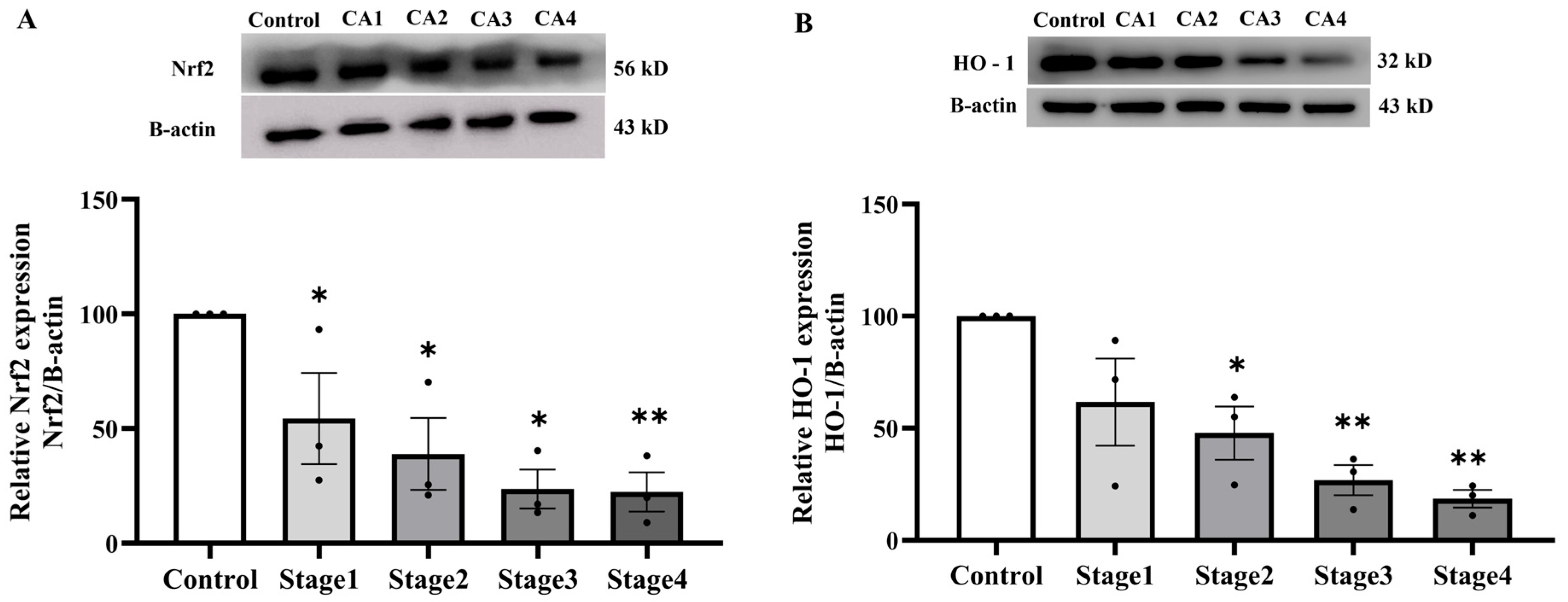 Nrf2 (A) and HO-1 (B) protein expressions in peritumoral adipose tissue of the control and cancer groups by stage (n = 3/group). Results are depicted as mean ± standard error (SEM). One-Way ANOVA was used for comparisons between groups. ** p < 0.001, * p < 0.05. CA: cancer group.