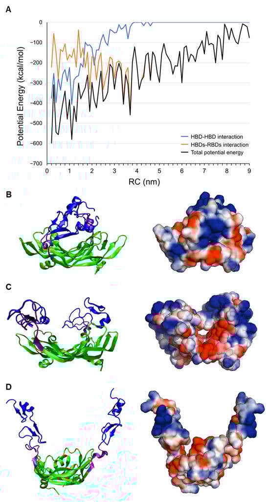 (A) Profiles of inter-domain interaction energies along the reaction coordinate (RC): HBD–HBD interaction energy (blue), HBD–RBD interaction energy (orange), and their sum (black). (B–D) Solvent-accessible surface electrostatic potentials of VEGF165 at its varying structures with HBD-HBD distances of (B) 1.1 nm, (C) 3.5 nm, and (D) 9.0 nm. The conformations were taken from the last frames of the biased MD trajectories with the umbrella potentials centered at each given distance. The left panels show the structures with a coloring scheme of RBD: green, linker: purple, and HBD: blue. The right panels display the solvent-accessible surface electrostatic potential, with red indicating negative and blue indicating positive electrostatic potential, represented on a scale ranging from −1.5 to 1.5 kBT/e with T = 298 K.
