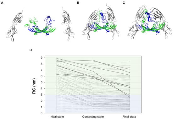 To investigate whether the binding of VEGF165 to VEGFR-2 requires adjustments in the HBD–HBD distance, we constructed 89 initial complex models. During the initial structural overlay onto the experimental template (PDB ID: 3V2A) [23], steric clashes occurred especially for conformations with HBD–HBD distances exceeding 3 nm. To circumvent this, the two VEGFR-2 units were temporarily translated 4 nm away from the RBD. This procedure created sufficient separation to eliminate any steric clashes (Figure 4A). Each VEGFR-2 was then pulled back along the same vector toward dimeric RBD COM until reaching their initial superimposed positions (Figure 4B). The generated 89 VEGFR-2/VEGF165 complexes then underwent MD simulations for 100 ns (Figure 4C).