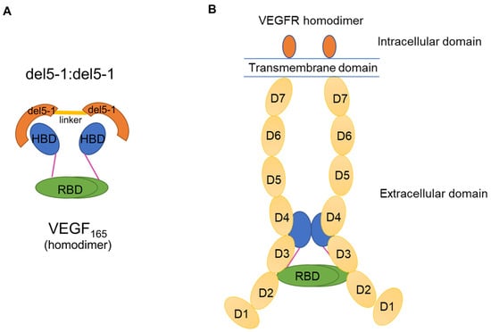 (A) Schematic representation of the proposed binding mode between the del5-1:del5-1 aptamer dimer and the VEGF165 homodimer. The orange ovals represent the two del5-1 aptamer domains connected by a flexible linker, which “encircle” the HBD of the VEGF165 by coulombic interaction. (B) Architectural overview of the native VEGF165/VEGFR homodimer complex on the cell membrane. This illustration highlights that del5-1:del5-1 aptamer dimer could potentially interfere with the interaction between the VEGF165 ligand and the VEGFR homodimer, thereby modulating or inhibiting the downstream signaling pathway.