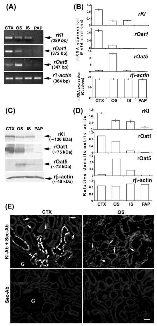 Expression and immunodistribution of rKl along the rat nephron. (A) Expression of rKl, rOat1, and rOat5 mRNA in various nephron zones was studied by end-point RT-PCR using the housekeeping gene rβ-actin as an endogenous control. The figure shows images of agarose gel electrophoresis representative of similar findings in cDNA preparations from three male rats. (B) Expression of rKl, rOat1, and rOat5 mRNA in various kidney zones was studied by qRT-PCR and analyzed by comparative 2−ddCt method using the rβ-actin as endogenous control. The data are presented relative to the rKl mRNA in cortex; also shown is the mean ± SEM of data from cDNA preparations from three male rats. (C) Western blot of TCM proteins from various rat kidney zones was studied with Kl-Ab (KO603), Oat1-Ab, or Oat5-Ab using the rβ-actin as a loading control. Relative molecular mass (Mr, kDa) of protein bands was estimated by the protein ladder. Each well contained 80 μg protein. The figure also shows Western blot images representative of similar findings in TCM preparations from three male rats. (D) Densitometric evaluation of protein bands shown in C. Each bar is the mean ± SEM of data in TCM preparations from three male rats. (E) Immunodistribution of rKl protein in the rat kidneys was studied using the Kl-Ab (AF1819). The images of immunofluorescence staining representative of similar findings in cryosections from three male rats are also shown. Arrows, weak staining of the basolateral membrane of proximal convoluted tubules and proximal straight tubules in the cortex and outer stripe, respectively. Arrowheads, strong staining in epithelial cells of distal nephron segments. Individual tubules were identified based on their morphology and localization in specific nephron segments. The scale bar is 20 μm. CTX = cortex; G = glomerulus; IS = inner stripe; OS = outer stripe; Sec-Ab = secondary antibody; PAP = papilla.