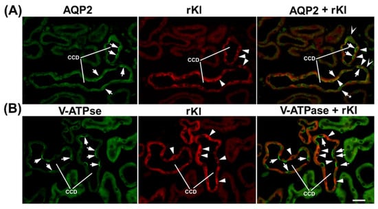 - Kim, J.; Kim, Y.H.; Cha, J.H.; Tisher, C.C.; Madsen, K.M. Intercalated Cell Subtypes in Connecting Tubule and Cortical Collecting Duct of Rat and Mouse. J. Am. Soc. Nephrol. 1999, 10, 1–12. [Google Scholar] [CrossRef] [PubMed]