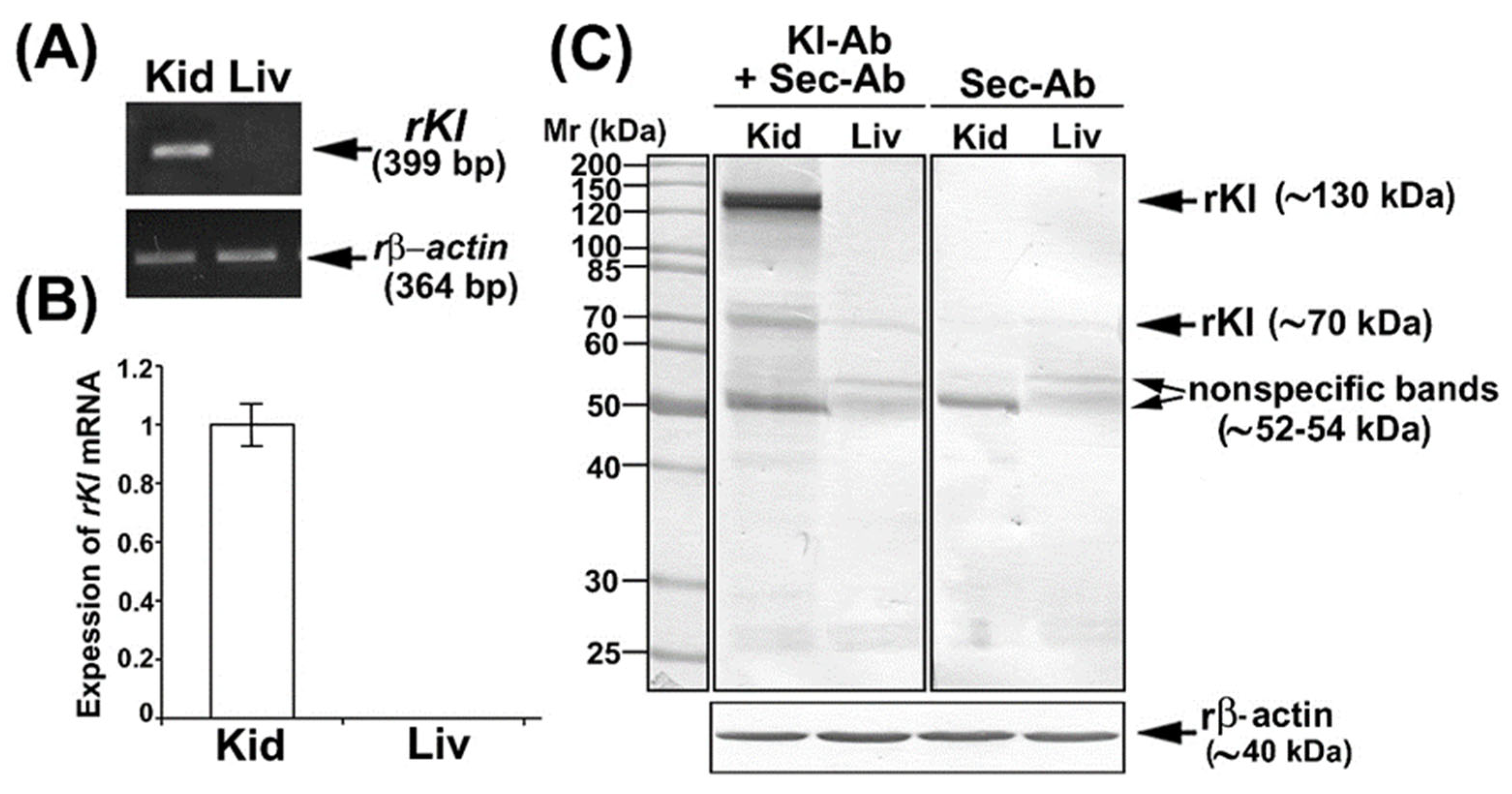 Figure 1. Expression of rKl mRNA in rat tissues and characterization of Kl-Ab (KO6039) by Western blotting. (A) Expression of rKl mRNA in rat kidney and liver was studied by end-point RT-PCR using the housekeeping gene rβ-actin as an endogenous control. The figure shows images of agarose gel electrophoresis representative of similar findings in cDNA preparations from three male rats. (B) Expression of rKl mRNA in rat kidney and liver was measured by qRT-PCR and analyzed by comparative 2−ddCt method using the rβ-actin as endogenous control. rKl mRNA expression in the liver was plotted relative to the rKl mRNA in the kidney; also shown is the mean ± SEM of data collected from cDNA preparations of three male rats. (C) Western blot of TCM proteins from rat kidney and liver was studied with the Kl-Ab (KO603) using the rβ-actin as a loading control. Relative molecular mass (Mr, kDa) of protein bands was estimated by the protein ladder. Each well contained 80 μg protein. The figure also shows images of Western blotting representative of similar findings in TCM preparations from three male rats. Kid = kidney; Kl-Ab = anti-Klotho antibody; Liv = Liver; Sec-Ab = secondary antibody; Mr = relative molecular mass.