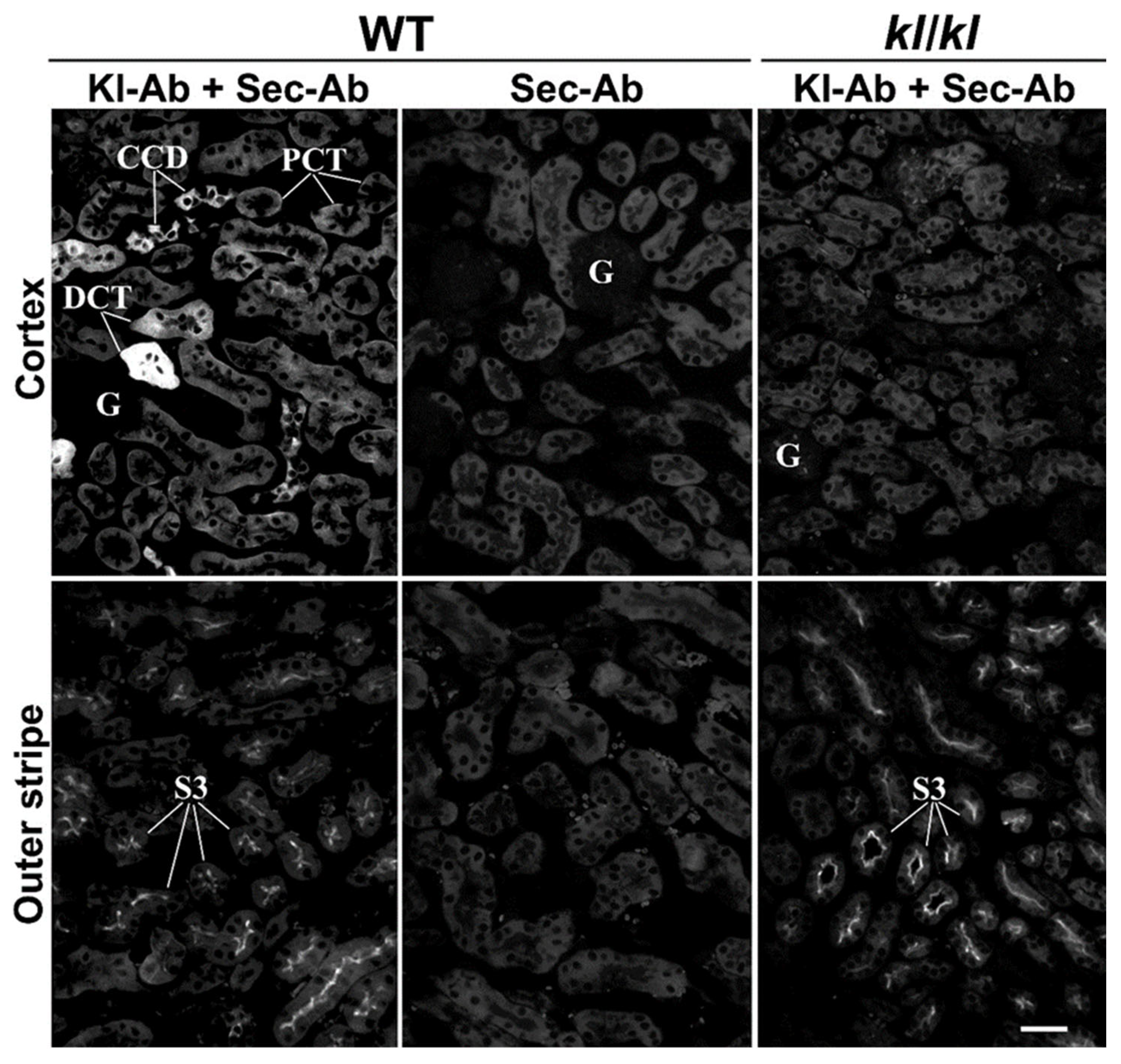 Figure 2. Characterization of Kl-Ab (AF1819) by immunofluorescence cytochemistry. The figure shows images of immunofluorescence staining with Kl-Ab (AF1819) representative of similar findings in cryosections from three wild-type (kl+/+) and three Klotho-deficient (kl/kl) male mice. Individual tubules were identified based on their morphology and localization in the specific nephron zones, including cortex (proximal convoluted tubules, distal convoluted tubules, and cortical collecting ducts) and outer stripe (proximal straight tubules). The scale bar is 20 μm. CCD = cortical collecting ducts; DCT = distal convoluted tubules; G = glomerulus; kl/kl = klotho-hypomorphic mice; Kl-Ab = anti-Klotho antibody; PCT = proximal convoluted tubules; Sec-Ab = secondary antibody; S3 = proximal straight tubules; WT = wild-type.