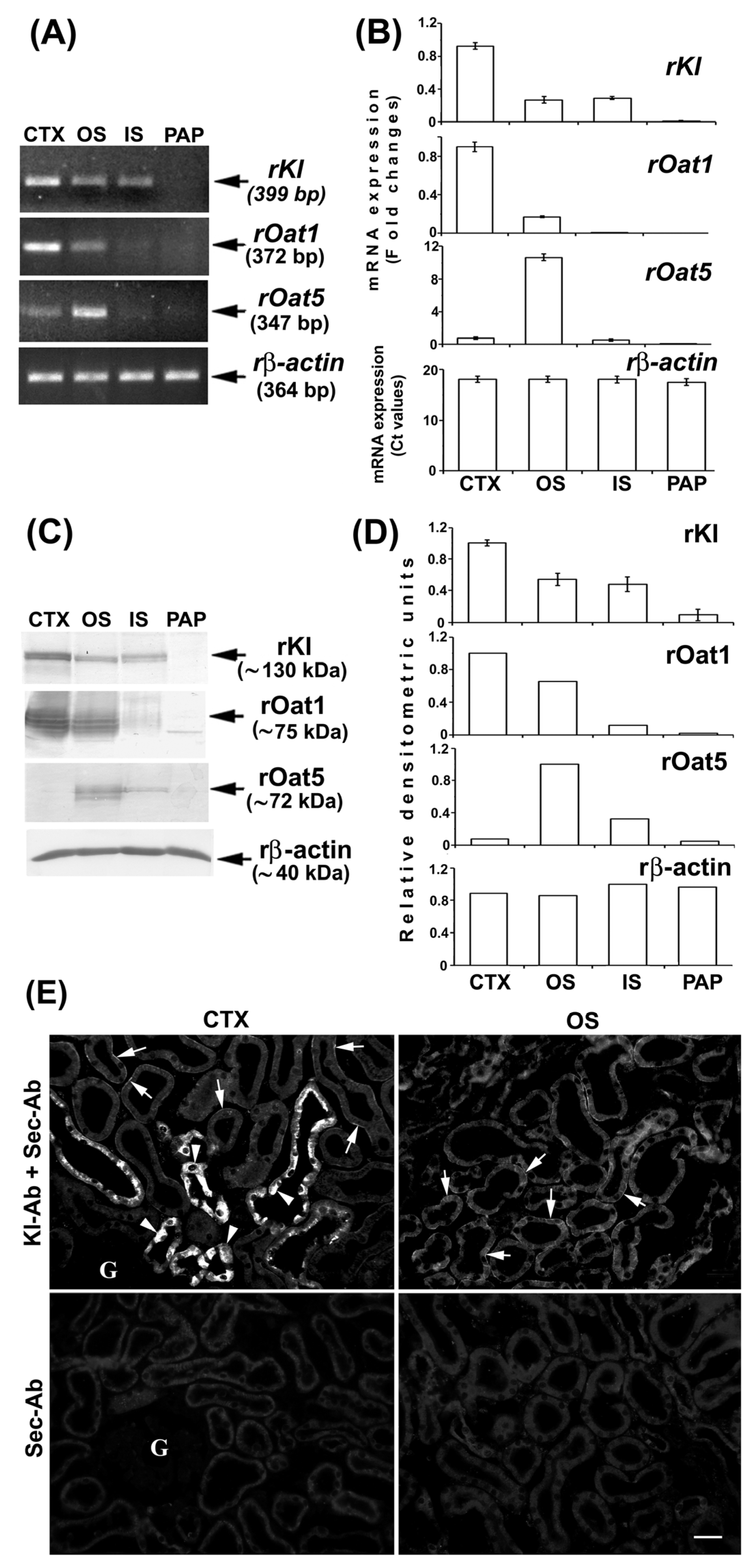Figure 3. Expression and immunodistribution of rKl along the rat nephron. (A) Expression of rKl, rOat1, and rOat5 mRNA in various nephron zones was studied by end-point RT-PCR using the housekeeping gene rβ-actin as an endogenous control. The figure shows images of agarose gel electrophoresis representative of similar findings in cDNA preparations from three male rats. (B) Expression of rKl, rOat1, and rOat5 mRNA in various kidney zones was studied by qRT-PCR and analyzed by comparative 2−ddCt method using the rβ-actin as endogenous control. The data are presented relative to the rKl mRNA in cortex; also shown is the mean ± SEM of data from cDNA preparations from three male rats. (C) Western blot of TCM proteins from various rat kidney zones was studied with Kl-Ab (KO603), Oat1-Ab, or Oat5-Ab using the rβ-actin as a loading control. Relative molecular mass (Mr, kDa) of protein bands was estimated by the protein ladder. Each well contained 80 μg protein. The figure also shows Western blot images representative of similar findings in TCM preparations from three male rats. (D) Densitometric evaluation of protein bands shown in C. Each bar is the mean ± SEM of data in TCM preparations from three male rats. (E) Immunodistribution of rKl protein in the rat kidneys was studied using the Kl-Ab (AF1819). The images of immunofluorescence staining representative of similar findings in cryosections from three male rats are also shown. Arrows, weak staining of the basolateral membrane of proximal convoluted tubules and proximal straight tubules in the cortex and outer stripe, respectively. Arrowheads, strong staining in epithelial cells of distal nephron segments. Individual tubules were identified based on their morphology and localization in specific nephron segments. The scale bar is 20 μm. CTX = cortex; G = glomerulus; IS = inner stripe; OS = outer stripe; Sec-Ab = secondary antibody; PAP = papilla.