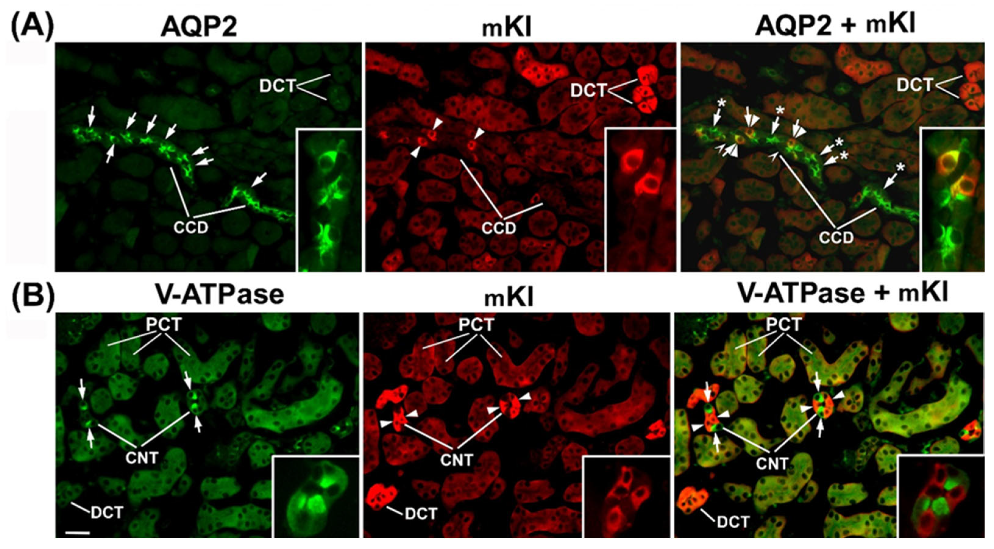 Figure 5. Cell-specific localization of mKl in the mouse cortical collecting ducts and connecting tubules. Double-immunostaining was performed in the cryosections of wild-type mouse kidneys using the Kl-Ab (AF1819) with AQP2-Ab or V-ATPase-Ab. Distal convoluted tubules (DCT), cortical collecting ducts (CCD), connecting tubules (CNT), and proximal convoluted tubules (PCT) were identified based on their localization and morphology. The figure shows images of immunofluorescence staining representative of similar findings in cryosections from three male wild-type mice. (A) AQP2 (green), mKl (red), and merged (AQP2 + mKl) images. Arrows—the AQP2-positive principal cells. Arrowheads—the mKl-positive cells. Arrows and Stars—the AQP2-positive principal cells without mKl-related staining. The cells labeled with Hollow Arrowheads are negative for both AQP2 and mKl (merged). The inset shows the CCD stained with AQP2-Ab and Kl-Ab in green, red, and merged mode. In some portion of mouse CCD, AQP2 (arrows, green) and mKl (arrowheads, red) colocalized (arrows and arrowheads, merged), thus proving the presence of mKl in the principal cells, whereas some AQP2-positive principal cells stayed mKl-negative (arrows and stars, merged). (B) V-ATPase (green), mKl (red), and merged (V-ATPase + mKl) images. Arrows—the V-ATPase-positive intercalated cells. Arrowheads—the mKl-positive epithelial cells. The inset shows the CNT stained with V-ATPase-Ab and Kl-Ab in green, red, and merged mode. In mouse CNT, V-ATPase (arrows, green) and rKl (arrowheads, red) did not colocalize (arrows and arrowheads, merged), thus proving the absence of mKl in the intercalated cells. The mKl-related staining is also visible in the basolateral membrane of proximal convoluted tubules (PCT). The scale bar is 20 μm for images in the same line, except for insets. CCD = cortical collecting ducts; CNT = connecting tubules; DCT = distal convoluted tubules; PCT = proximal convoluted tubules.