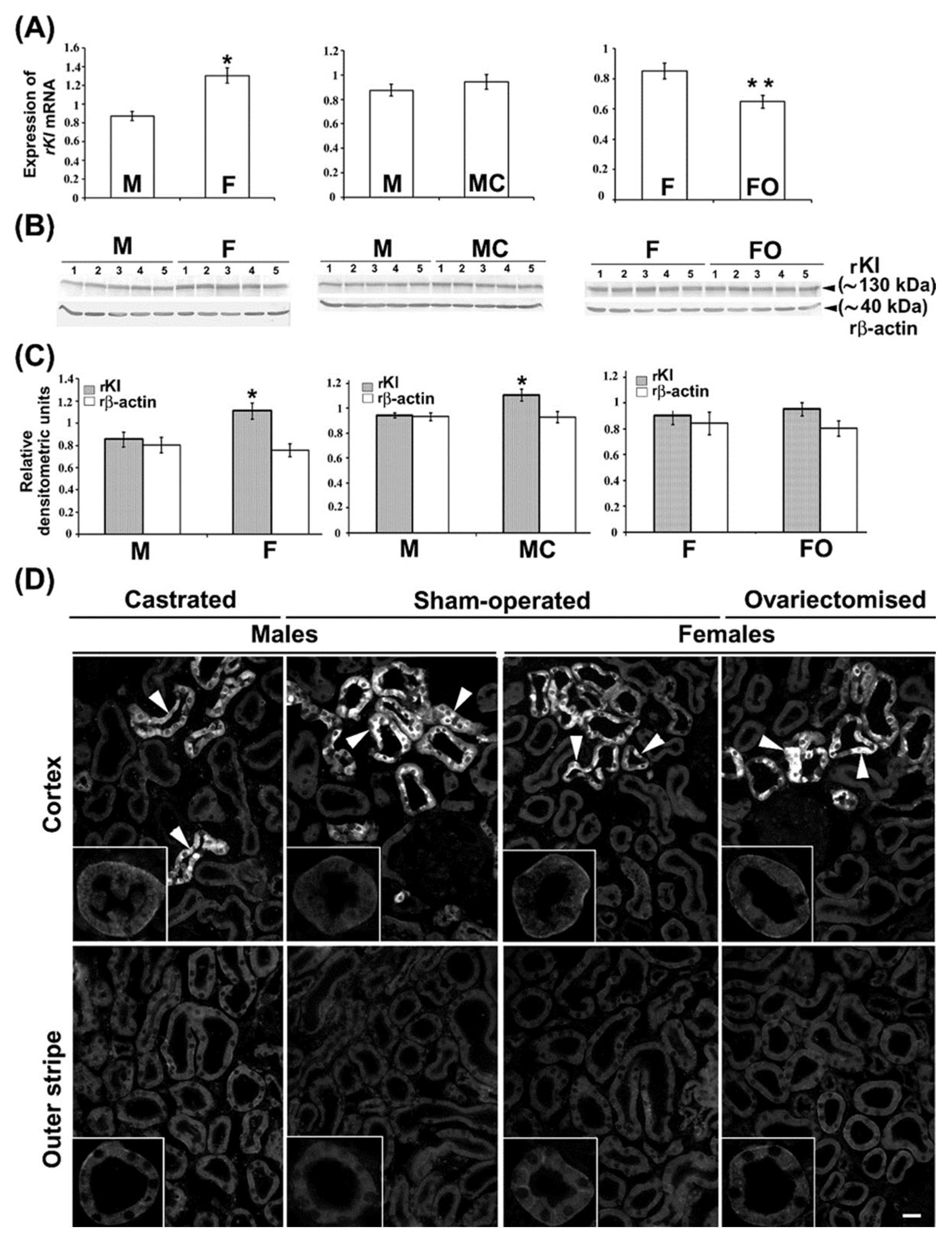 To examine the regulatory role of sex hormones on renal rKl expression, we tested the level of rKl mRNA and rKl protein in the kidneys of castrated males and ovariectomized females using the same analytical tools (qRT-PCR, WB, and IFC). Whereas castration had no effect (Figure 6A; M vs. MC), ovariectomy significantly downregulated (~24%) the expression of rKl mRNA when compared to sham-operated females (Figure 6A; F vs. FO). However, WB data in renal TCM exhibited a slightly different pattern; castration upregulated (~20%) the abundance of rKl protein band (Figure 6B,C; M vs. MC), while its expression in ovariectomized females remained unchanged (Figure 6B,C; F vs. FO). Expression of rβ-actin remained unaffected by gonadectomy of both males and females, demonstrating similar protein loading in all TCM samples (Figure 6B,C). Furthermore, IFC images showed similarity with WB data; castration increased the rKl-related immunofluorescence in the BLM of PCT and PST (Figure 6D; M vs. MC; Cortex and Outer stripe; insets), whereas ovariectomy had no effect (Figure 6D; F vs. FO; Cortex and Outer stripe; insets).