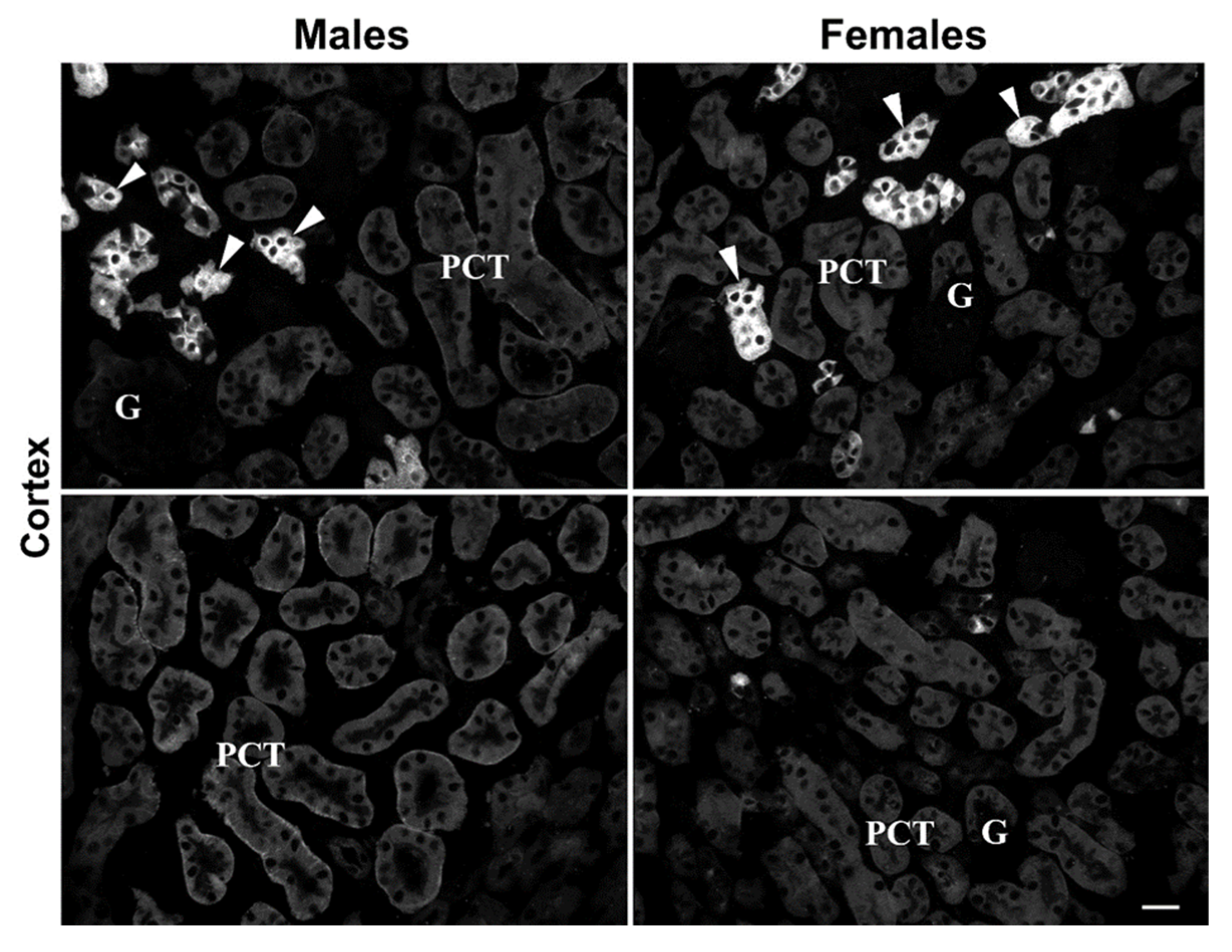 Figure 7. Male-dominant expression of mKl in the mouse kidneys. Immunodistribution of mKl in the mouse kidneys was studied by the Kl-Ab (AF1819). The figure shows images of immunofluorescence staining representative of similar findings in cryosections from four animals of each sex. Arrowheads—the mKl-positive staining in distal tubule cells. Different regions of cortex in the same animal of respective sex are also shown, having weaker (upper panel) or stronger (lower panel) mKl-fluorescence signals in BLM of proximal convoluted tubules. Scale bar is 20 μm. G = glomeruli; PCT = proximal convoluted tubules.