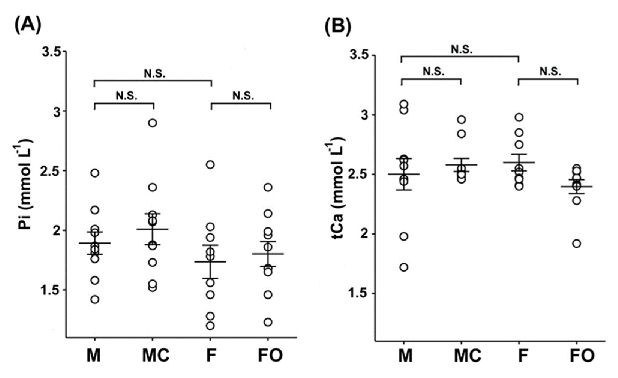 Figure 8. Inorganic phosphate (Pi) and total calcium (tCa) in rat plasma: sex differences and effect of gonadectomy. Concentrations of Pi (A) and tCa (B) were measured biochemically in the plasma of sham-operated and gonadectomised male and female rats. The figure shows data measured in plasma samples from 10 animals in each experimental group. Each dot represents a replicate of measured parameters; data are expressed as the mean ± SEM (n = 10). N.S. = no statistical significance at p < 0.05 evaluated by factorial ANOVA followed by Duncan post hoc test. F = sham-operated female; FO = ovariectomized female; M = sham-operated male; MC = castrated male.